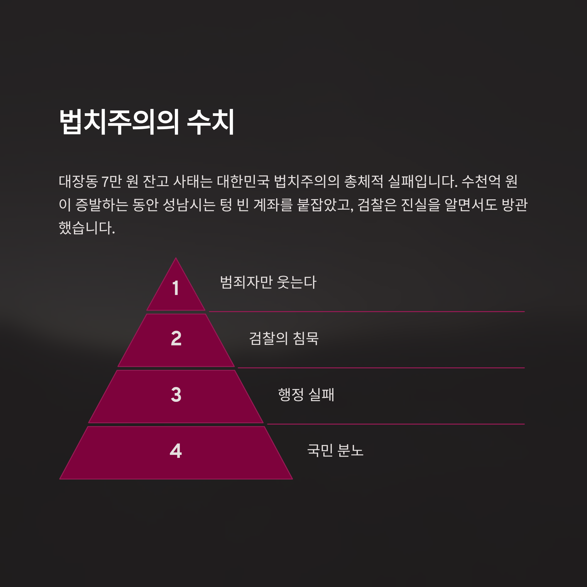 대장동 7만 원 잔고 사태는 대한민국 법치주의의 수치이자 행정 시스템의 총체적 실패를 드러낸 상징적 사건입니다. 수천억 원의 국민적 자산이 눈앞에서 증발하는 동안, 성남시는 텅 빈 계좌를 붙잡고 승전보를 울리는 코미디를 연출했고, 검찰은 모든 진실을 알면서도 뒷짐을 지고 이를 방관했습니다. 이 기괴한 풍경 속에서 웃는 것은 오직 범죄자들뿐입니다.