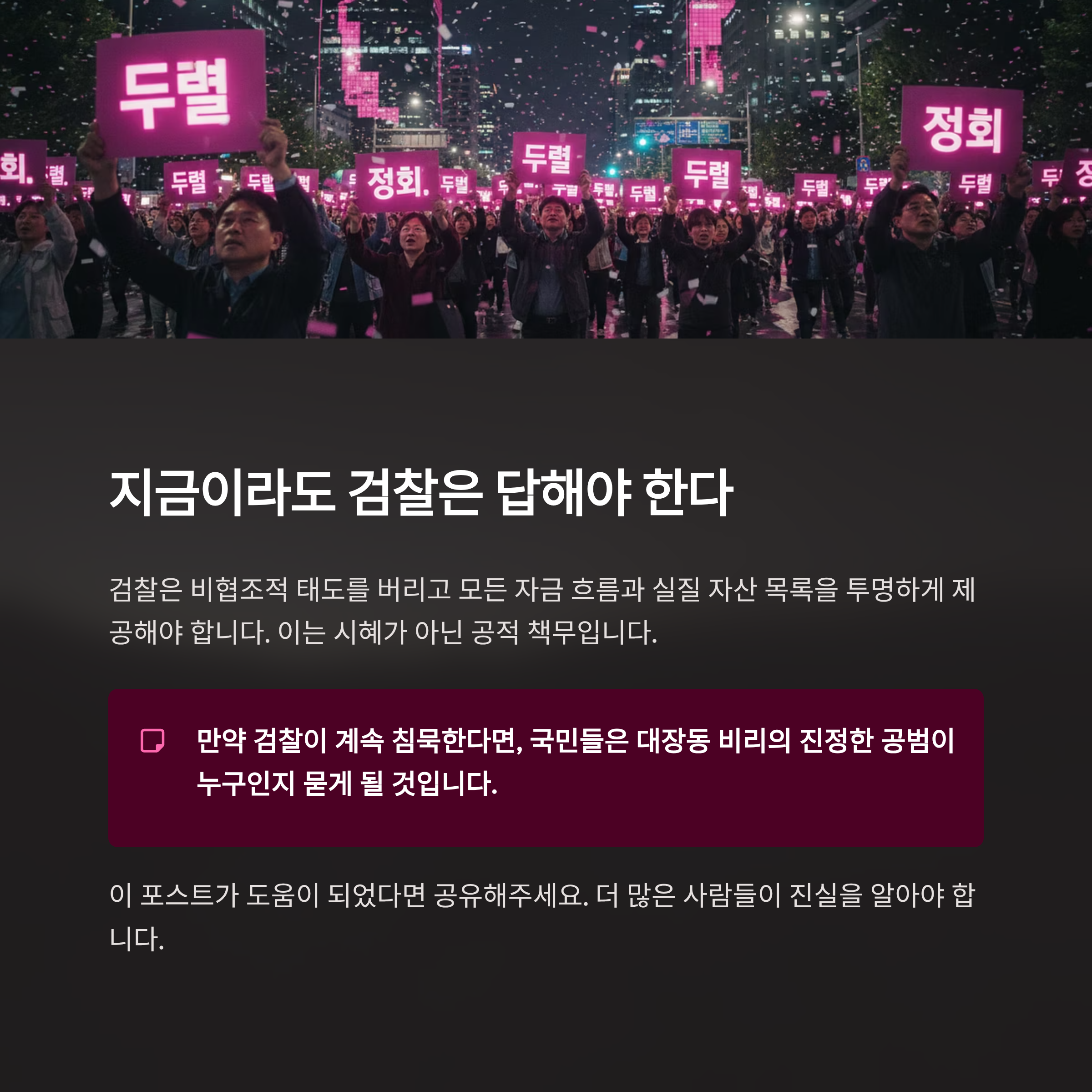 범죄 수익 환수는 타이밍과의 전쟁입니다. 시간이 흐를수록 자금은 더욱 교묘하게 세탁되고 은닉되어 추적이 불가능해집니다. 이제라도 검찰은 비협조적인 태도를 버리고, 성남시에 모든 자금 흐름과 실질 자산 목록을 투명하게 제공해야 합니다. 이는 검찰의 시혜가 아닌, 마땅히 이행해야 할 공적 책무입니다. 만약 검찰이 계속해서 침묵으로 일관한다면, 국민들은 대장동 비리의 진정한 공범이 누구인지 묻게 될 것입니다.
