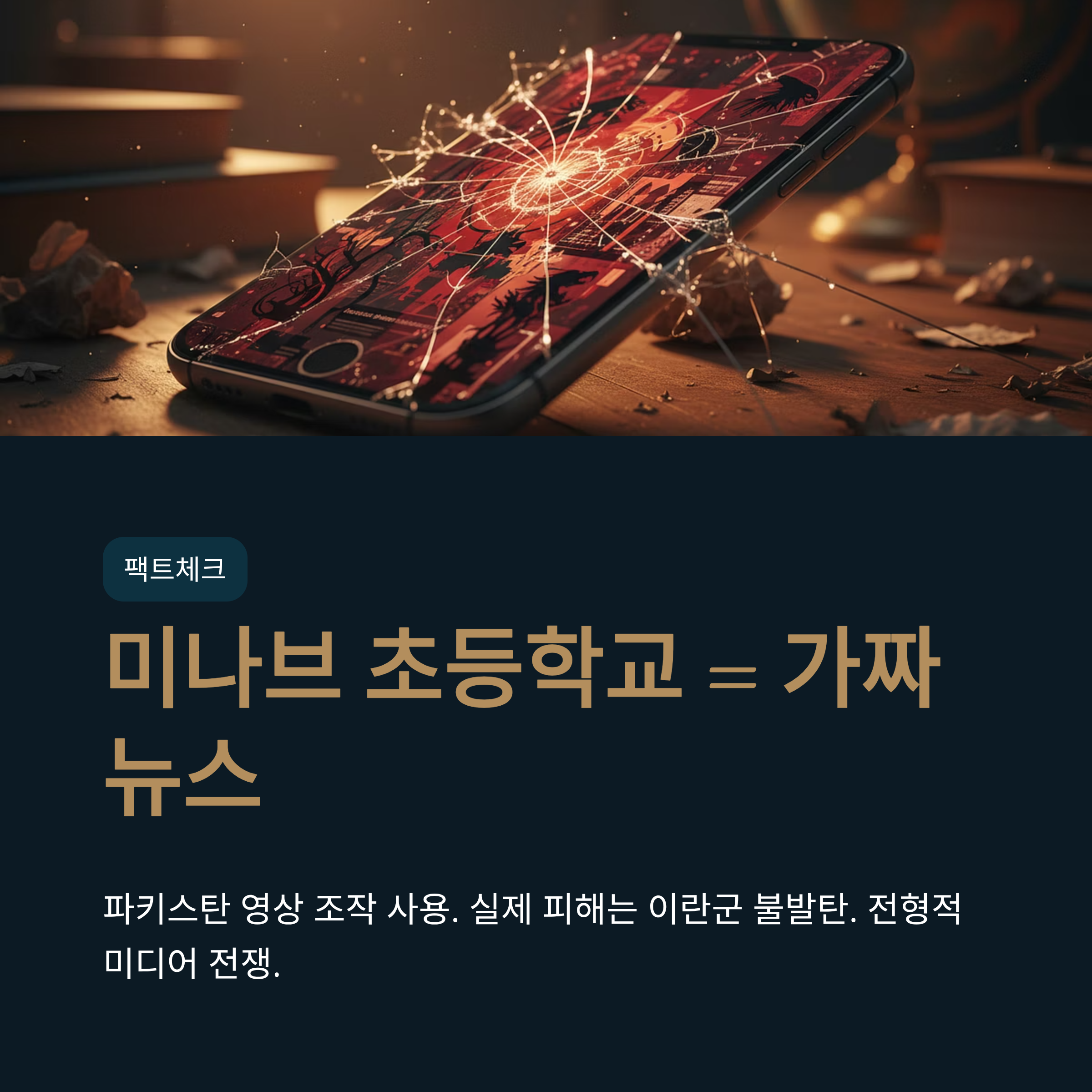 이란 측이 주장한 미나브 초등학교 공습은 파키스탄 영상을 조작한 가짜뉴스로, 이는 전형적인 이란 미디어 전쟁의 실체입니다.