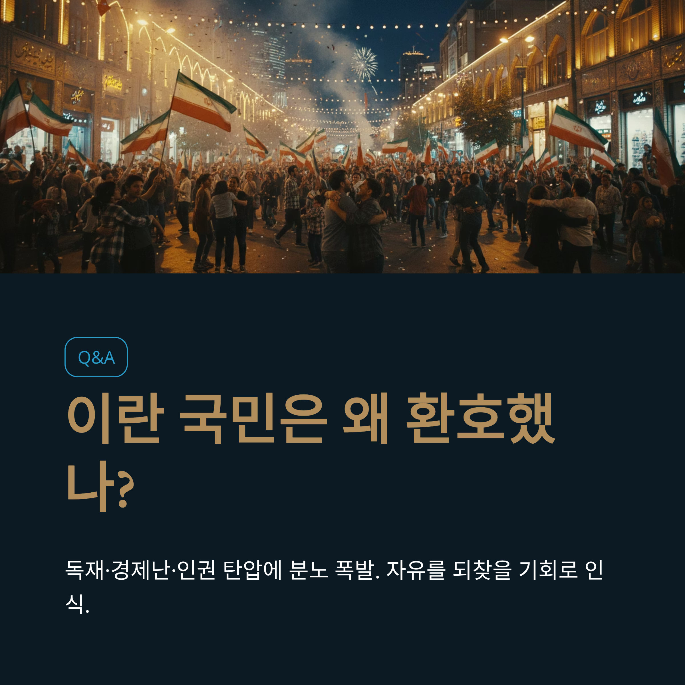 | A1. 오랜 기간 지속된 신정 일치 독재와 극심한 경제난, 잔혹한 인권 탄압에 대한 국민들의 분노가 극에 달했기 때문입니다. 이란 국민들은 최고 지도자의 죽음을 억압적인 독재 정권의 붕괴와 자유를 되찾을 수 있는 절호의 기회로 인식하고 있습니다. 따라서 지도자의 사망 소식에 슬퍼하기보다 새로운 변화를 기대하며 기뻐하는 아이러니한 상황이 연출된 것입니다. |