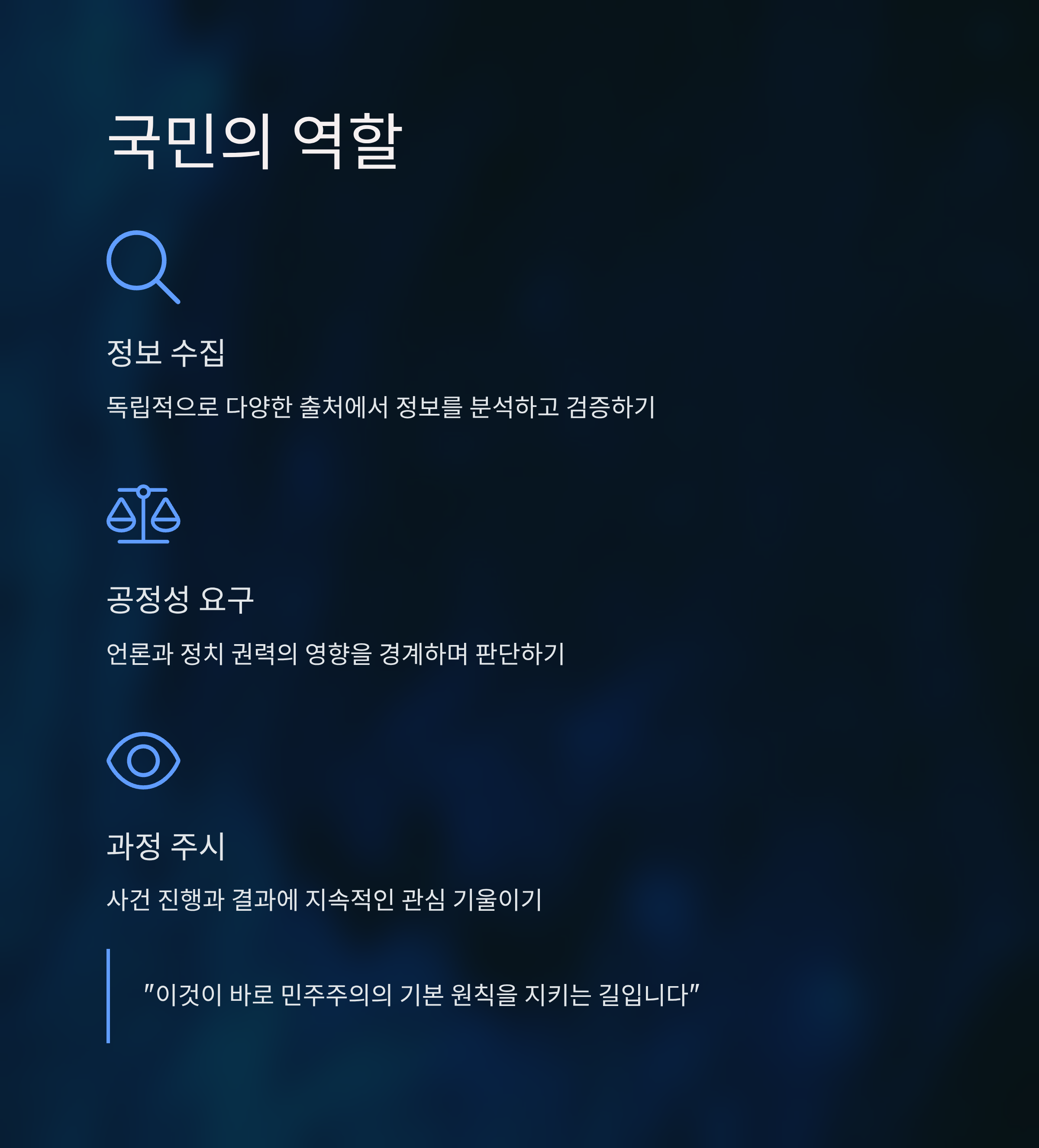이처럼 중요한 사건에서 진실에 가장 가까운 정보를 얻을 수 있도록 언론 개선과 함께 법적 시스템의 신뢰를 높이기 위한 지속적인 노력이 필요합니다. 무엇보다 국민은 사건의 배경과 첨예한 쟁점을 충분히 이해하고 활발히 문제를 제기해야 할 의무를 잊지 말아야 합니다.