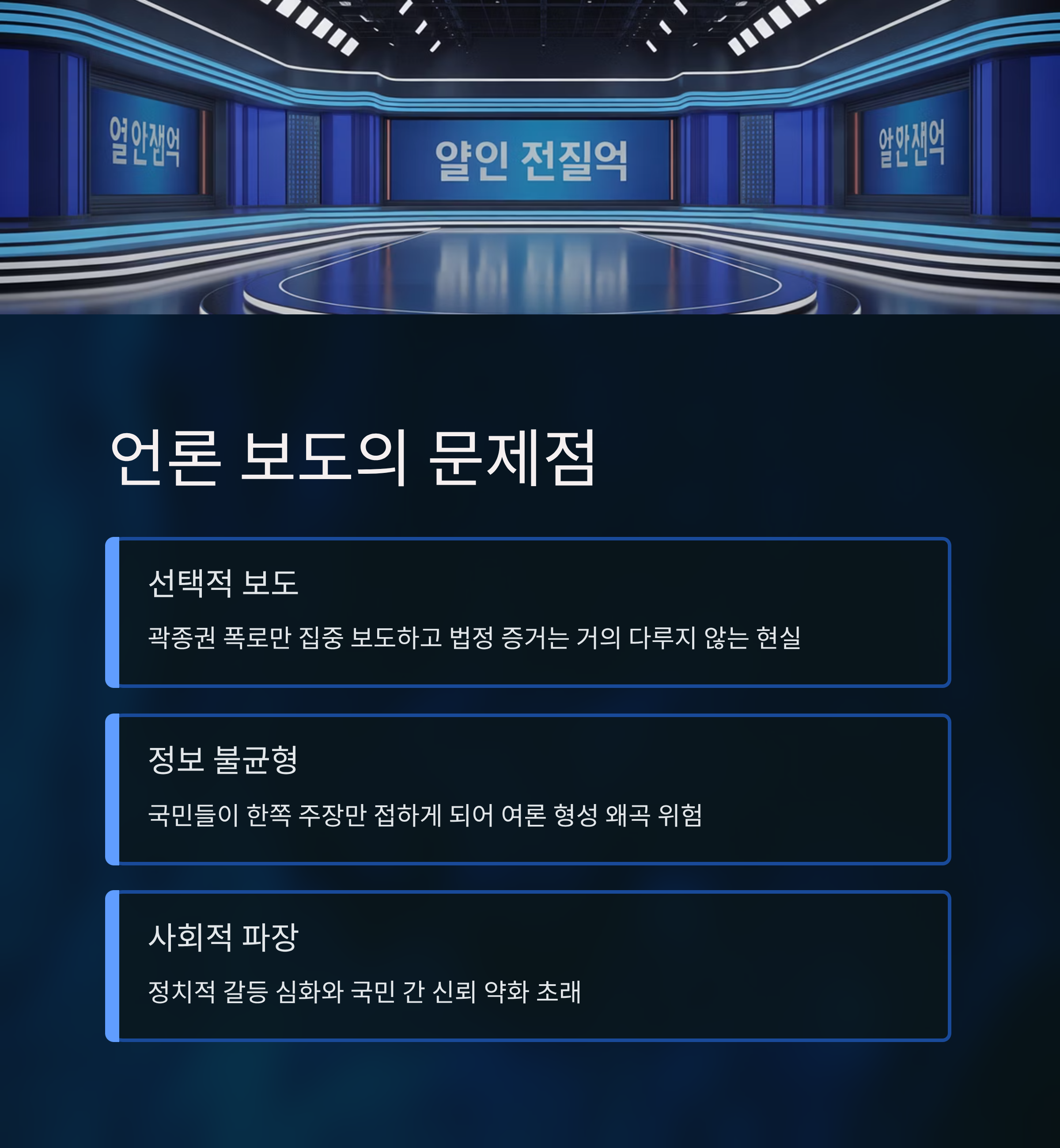 대다수 언론은 곽종권 전 사령관의 폭로 내용을 중심으로 보도해 왔습니다. 반면, 법정에서 나온 새로운 증거는 거의 다뤄지지 않고 있습니다. 이는 정보의 불균형을 초래하며, 국민들이 한쪽의 주장만을 접하게 만들어 여론 형성을 왜곡할 위험이 있습니다.