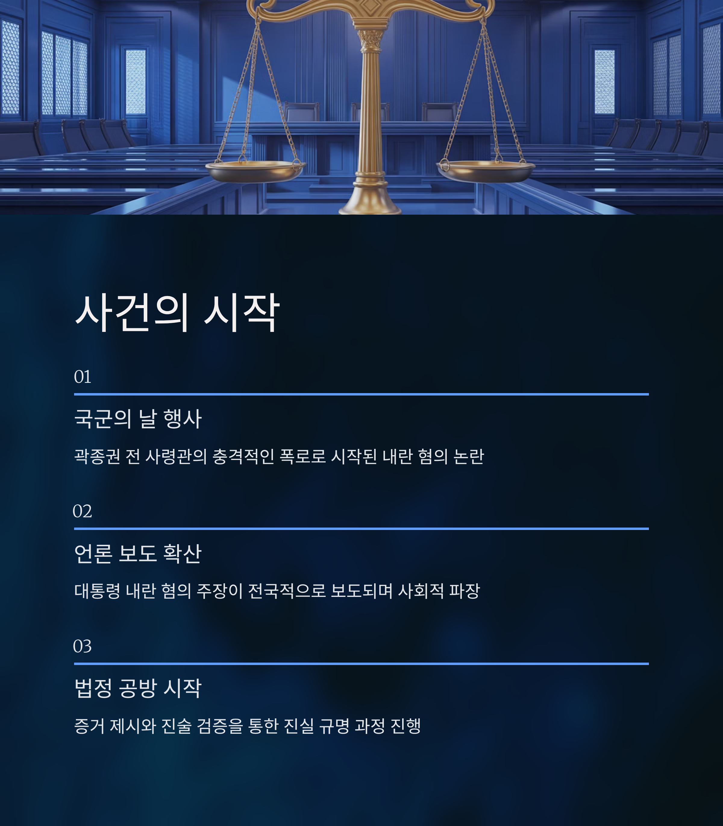 윤석열 대통령의 내란 혐의 사건은 대한민국 사회를 뜨겁게 달구고 있습니다. 국군의 날 행사 이후 곽종권 전 사령관의 충격적인 폭로에서 시작된 이 사건은 언론 보도와 법정 공방을 통해 진실 여부가 논의되고 있습니다. 해당 사건은 정치적 갈등을 넘어 국가 운영의 윤리와 법적 가치에도 심각한 영향을 미치고 있습니다. 이 글은 사건의 배경과 핵심 쟁점을 중심으로 국민들이 직접 진실을 판단할 수 있도록 돕고자 작성되었습니다.