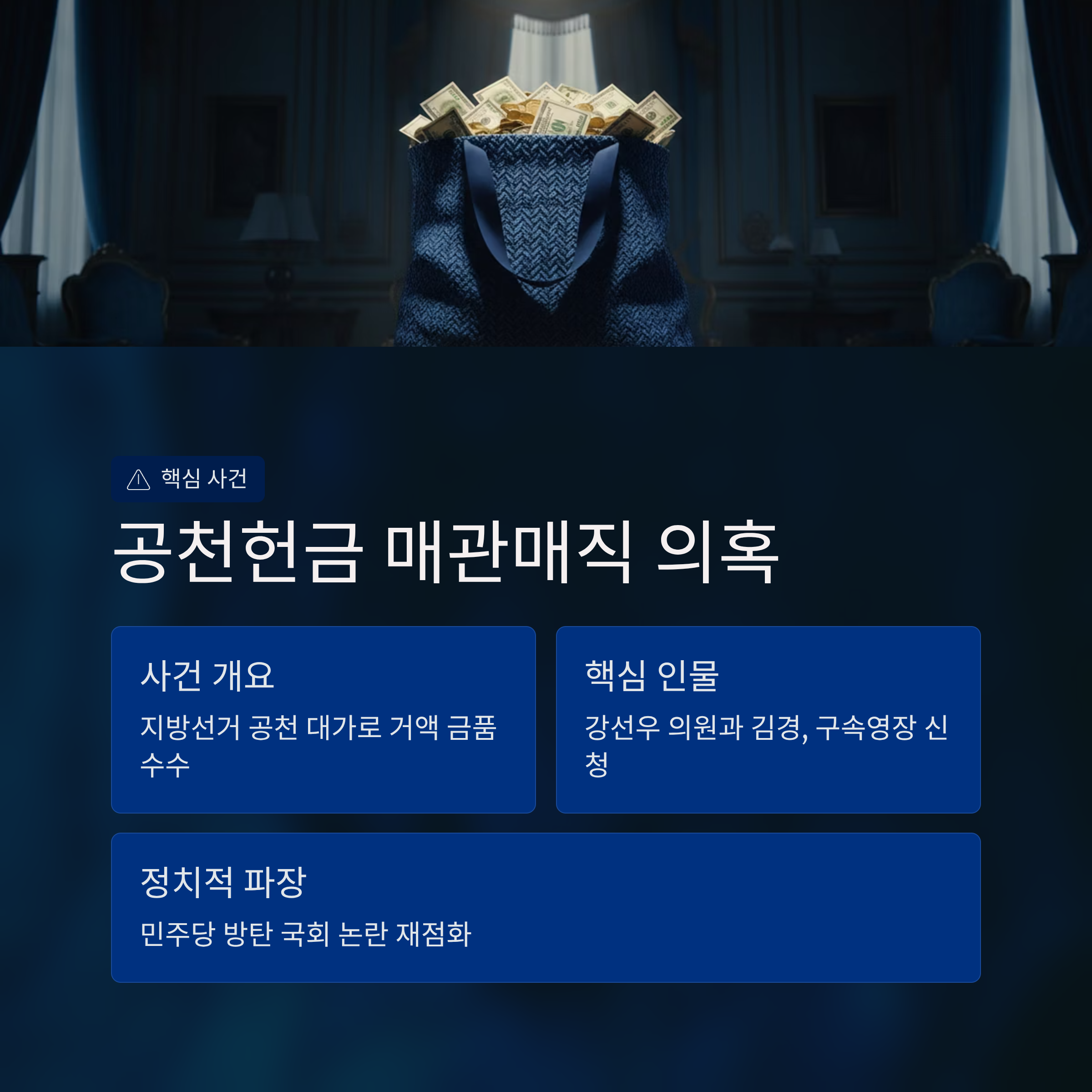 경찰이 민주당 공천헌금 사건의 핵심 인물인 강선우 의원과 김경에게 구속영장을 신청했습니다. 이번 사건은 지방선거 공천을 대가로 거액의 금품이 오간 매관매직 의혹으로, 쇼핑백 전달과 쪼개기 후원 등 구체적인 정황이 드러나 충격을 주고 있습니다. 2026년 현재 이재명 정부와 정청래 대표 체제의 민주당이 과연 '제 식구 감싸기'에 나설지, 아니면 읍참마속의 심정으로 손절할지 정치권의 이목이 쏠리고 있습니다. 본 글에서는 사건의 전말과 민주당이 직면한 딜레마를 심층 분석합니다.