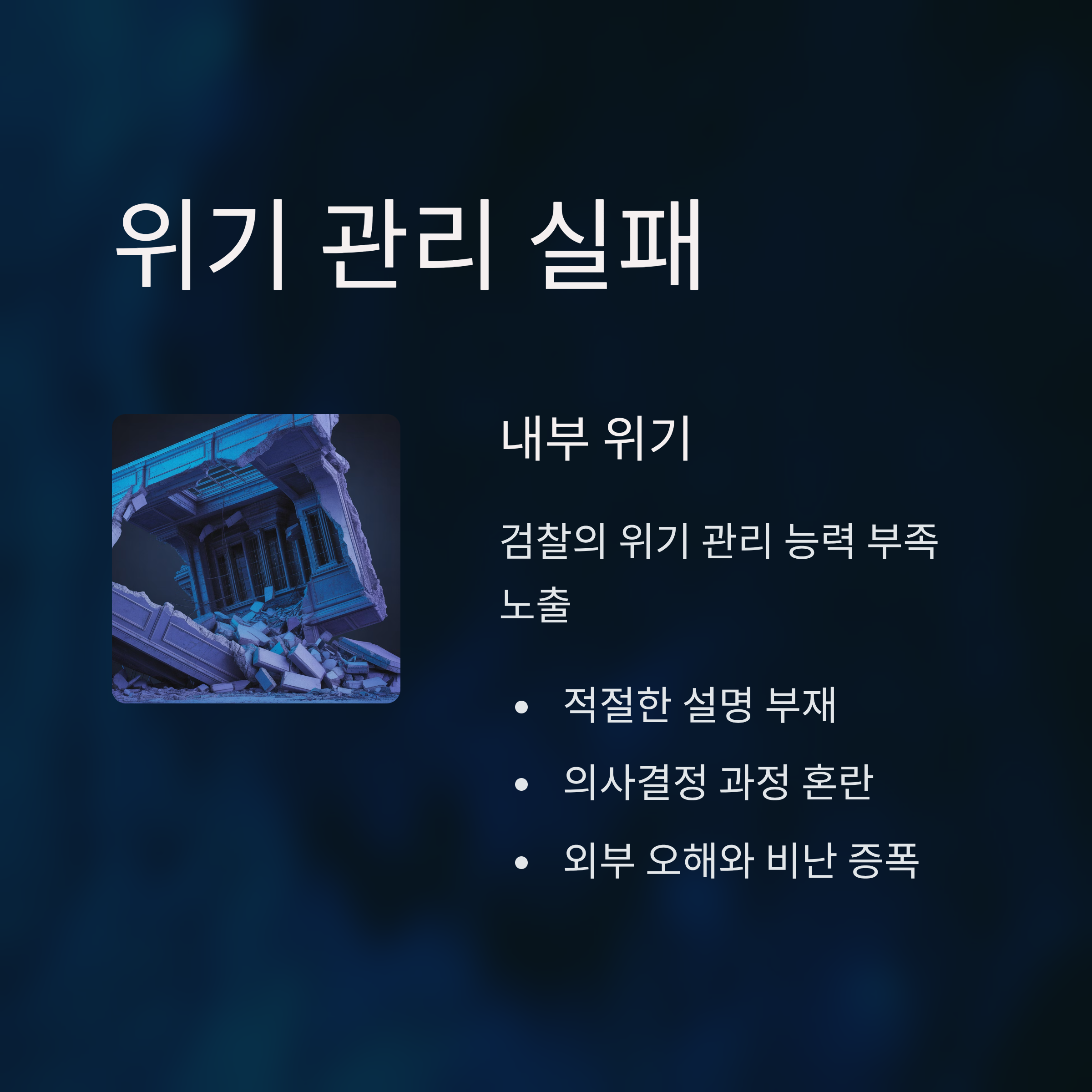 이번 사태는 검찰 내부의 위기 관리 능력이 부족하다는 점을 여실히 보여줍니다. 공판 검사들의 의견이 배제된 채 내부 정보 공유와 소통 부족이 드러났고, 일부 검사들은 조직 내부 채널을 통해 불만을 표출하기도 했습니다. 이는 조직 내 결속력 약화와 신뢰도 문제를 초래하는 요인으로 작용하고 있습니다. 여러 전·현직 관계자들이 이러한 상황을 두고 검찰의 독립성과 공정성 위기를 더 심화시키고 있다고 지적합니다.