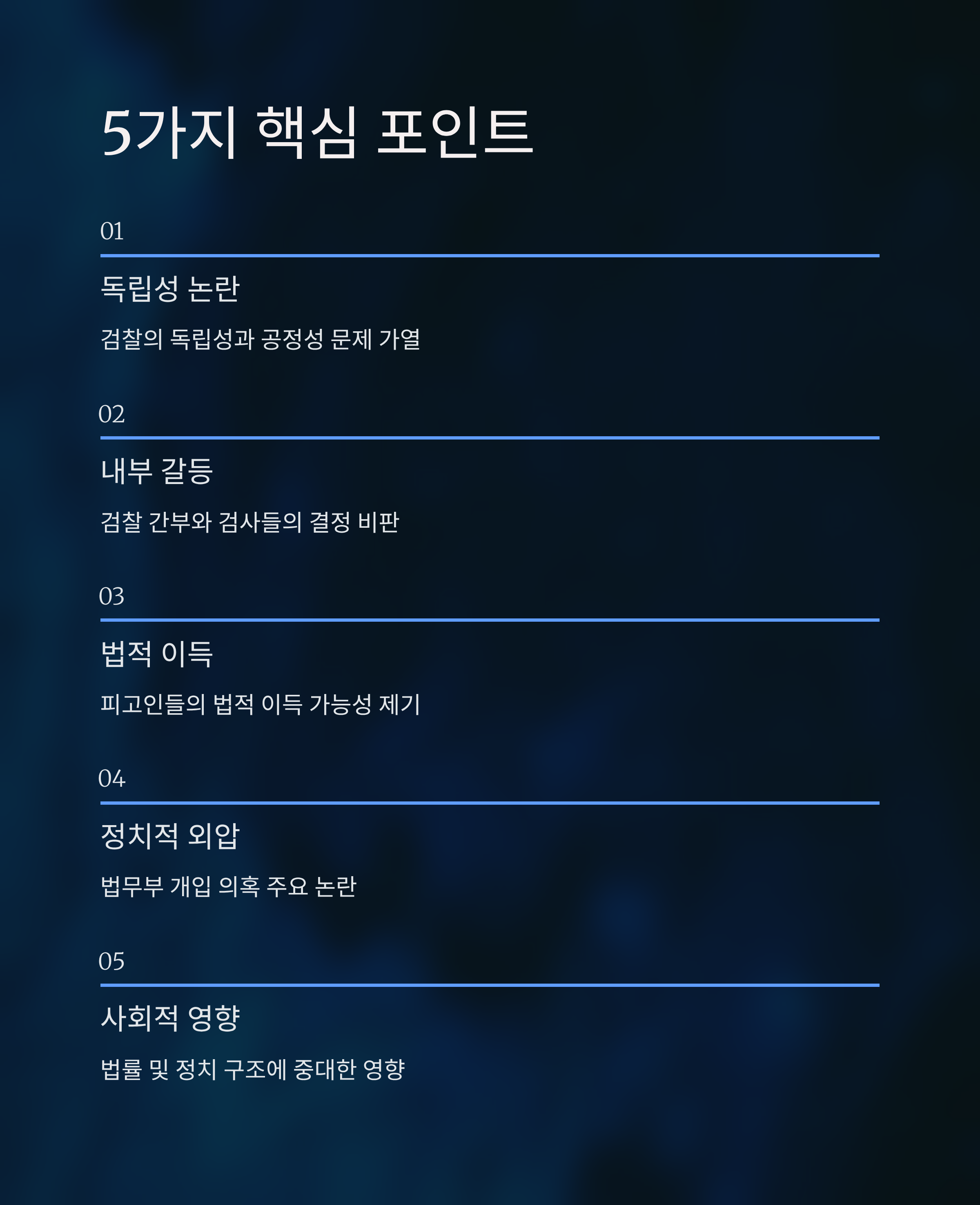 2. 일부 검찰 간부 및 검사들이 결정을 비판하며 조직 내부에서도 의견 갈등이 심화되고 있습니다.