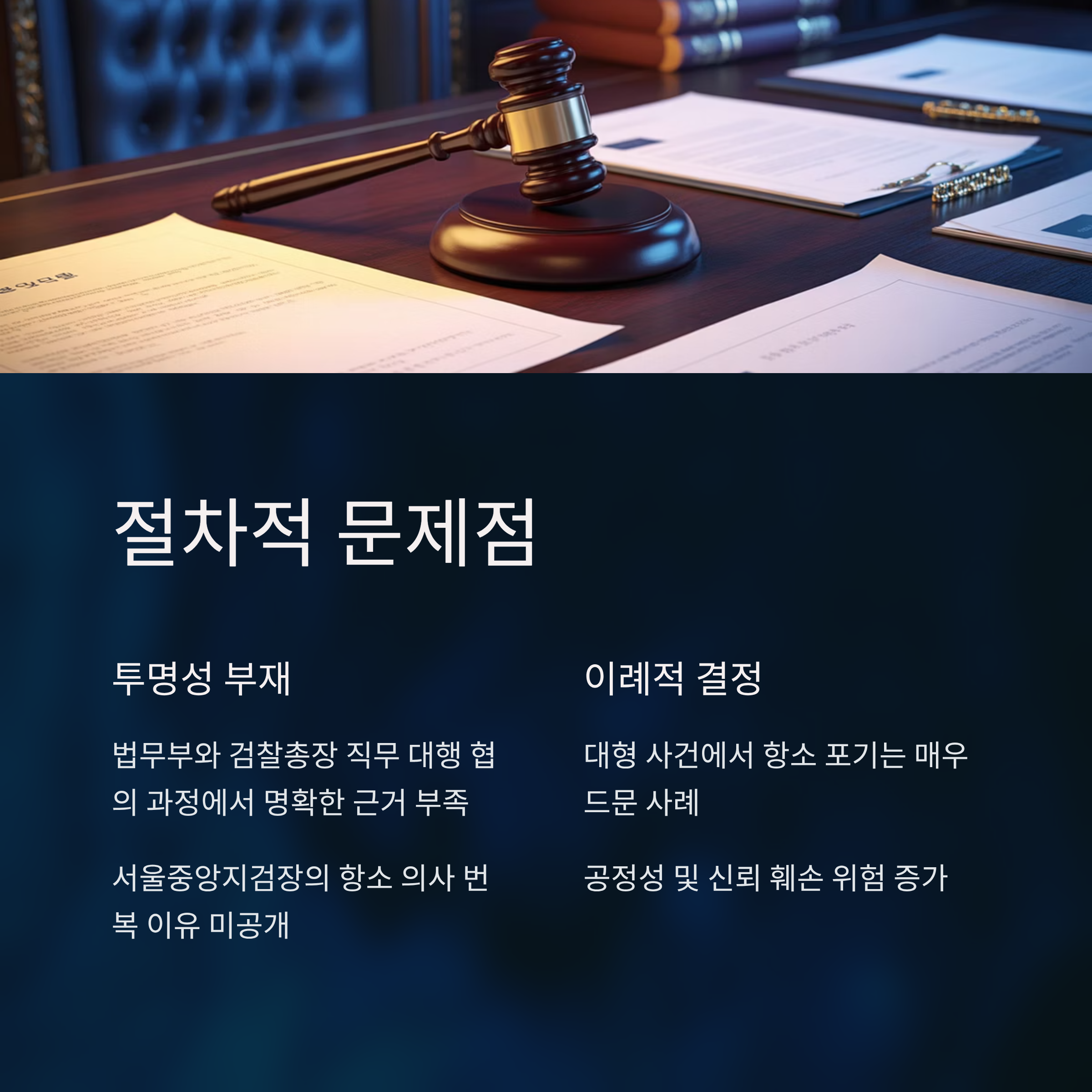 조직 내부에서조차 이러한 결정에 대한 적절한 설명이 부족했다는 것은, 검찰의 미래 운영과 국민 신뢰 회복을 어렵게 만드는 발판이 될 수 있습니다. 즉, 이러한 의사결정 과정에서의 갈등과 혼란은 내부적으로 통합을 이루지 못할 뿐만 아니라 외부적으로도 큰 오해와 비난을 불러일으키고 있습니다.
