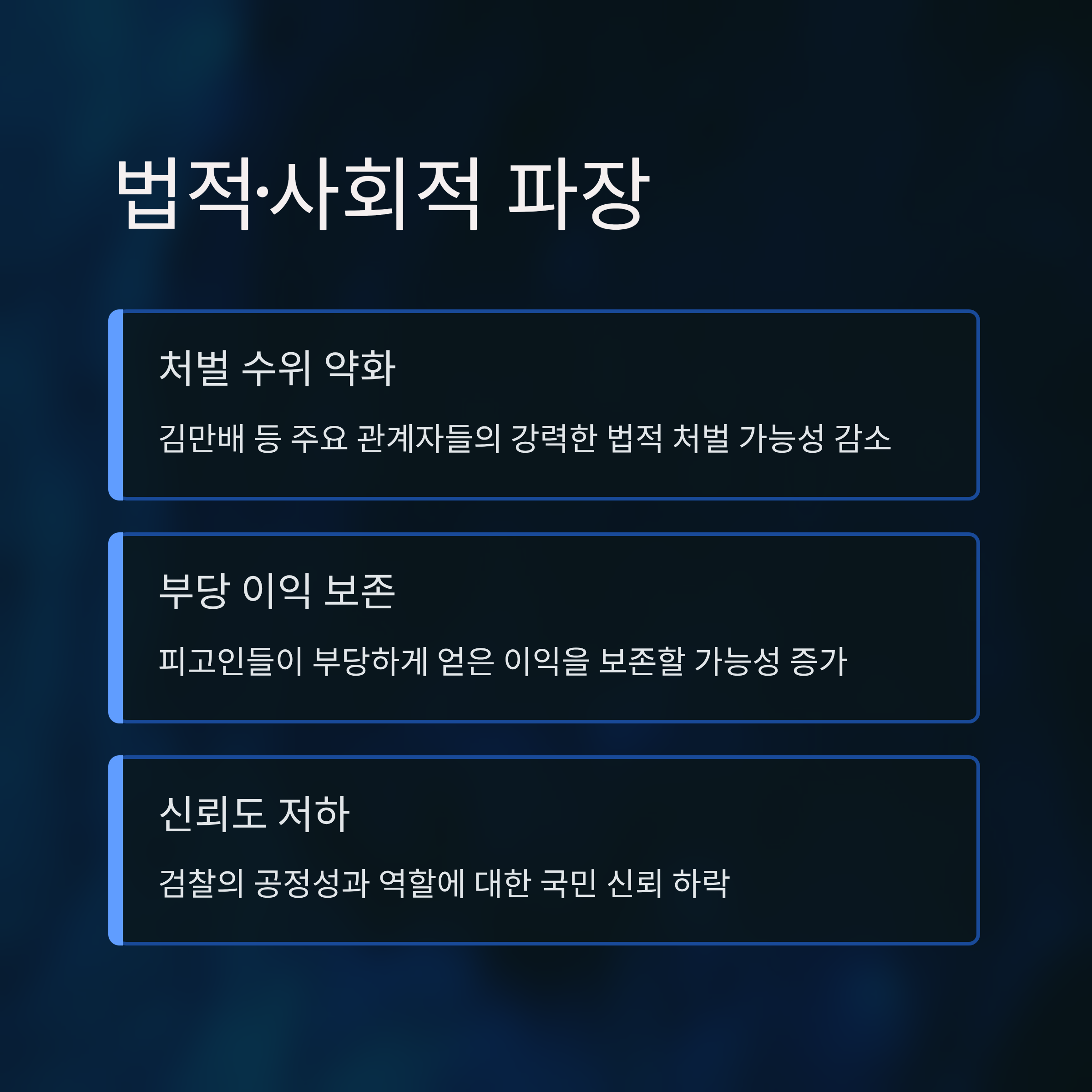 3. 항소 포기 이후 대장동 사건 피고인들이 법적 이득을 볼 가능성이 제기되며, 이에 따른 사회적 신뢰 손실 우려가 커지고 있습니다.