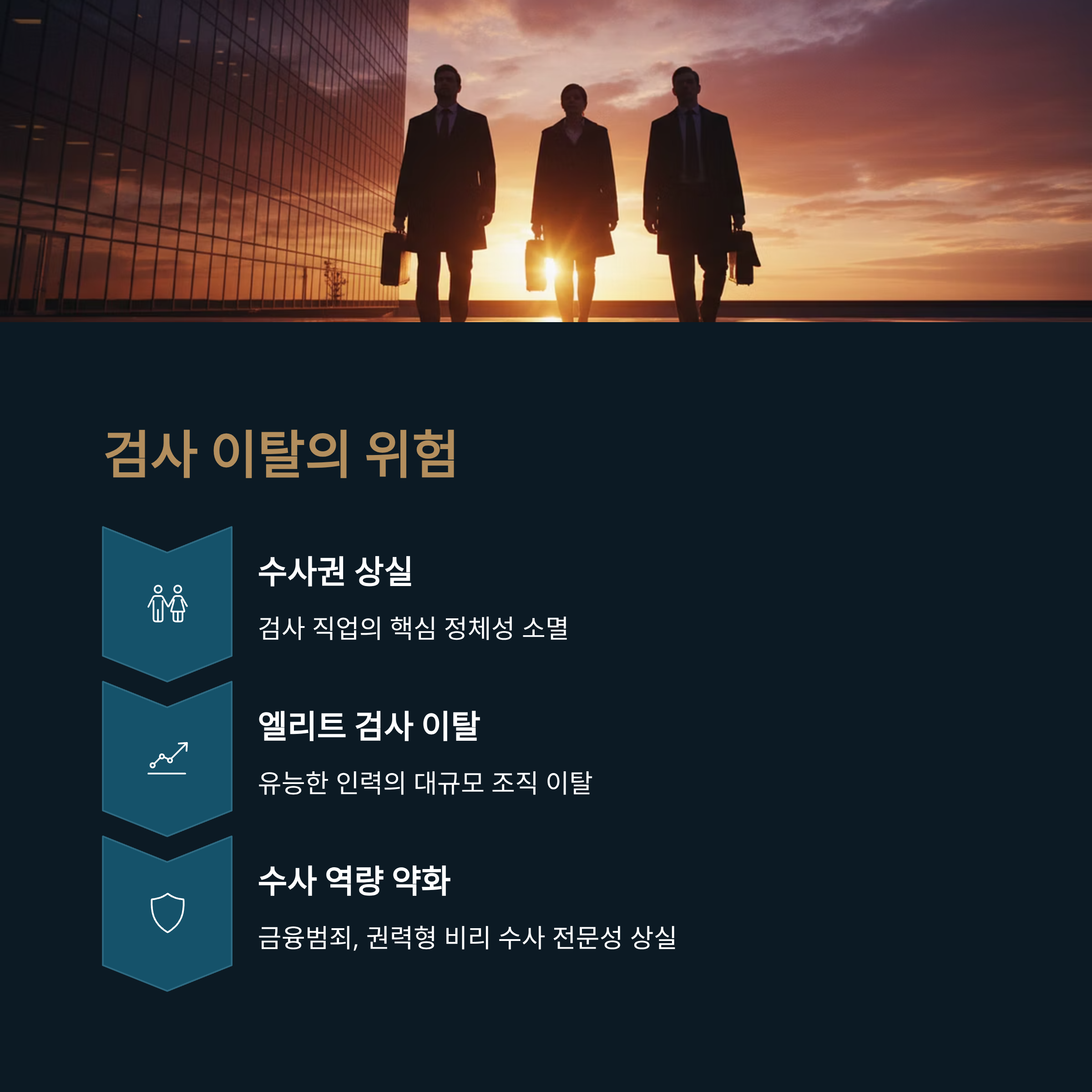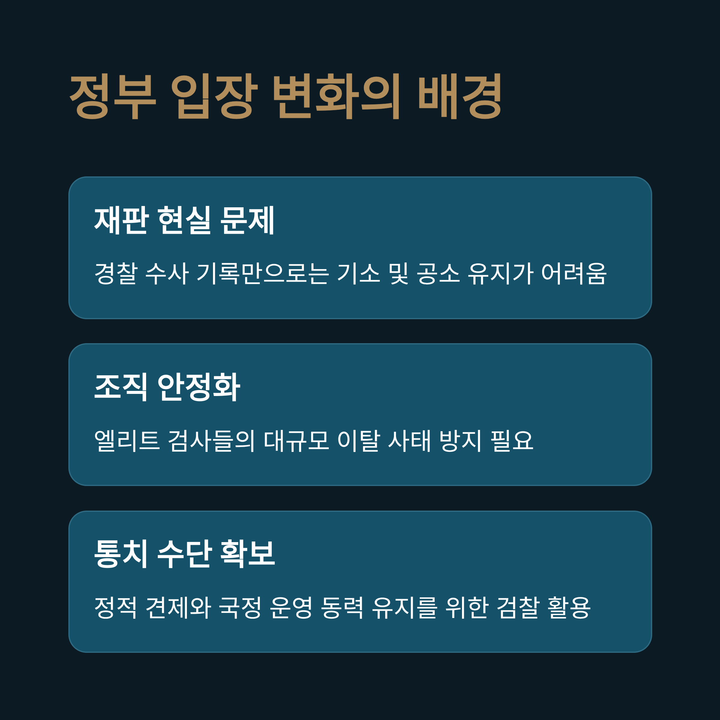 또한, 수사권 완전 박탈 시 예상되는 엘리트 검사들의 대규모 이탈 사태를 막기 위한 조직 안정화 목적도 포함됩니다.
