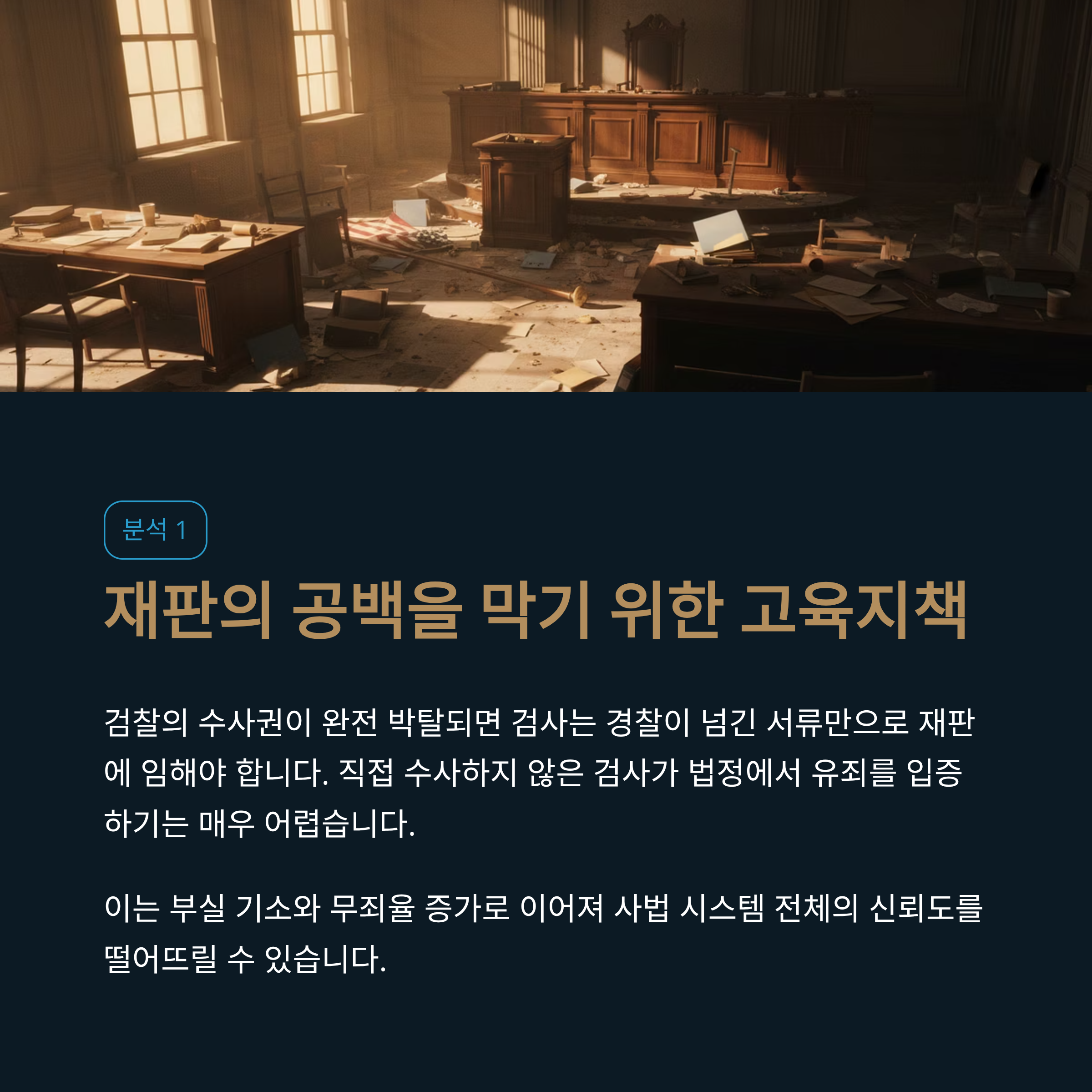 정부가 수사권 완전 폐지에서 한발 물러선 가장 표면적인 이유는 ‘재판 현실’의 문제입니다. 검찰의 수사권이 완전히 박탈되면, 검사는 경찰이 넘긴 수사 기록 서류만으로 기소 여부를 판단하고 재판에 임해야 합니다. 하지만 직접 사건을 수사하지 않은 검사가 법정에서 피고인의 주장과 변론을 효과적으로 반박하고 유죄를 입증하기란 현실적으로 매우 어렵습니다. 이는 부실 기소와 무죄율 증가로 이어져 사법 시스템 전체의 신뢰도를 떨어뜨릴 수 있습니다.