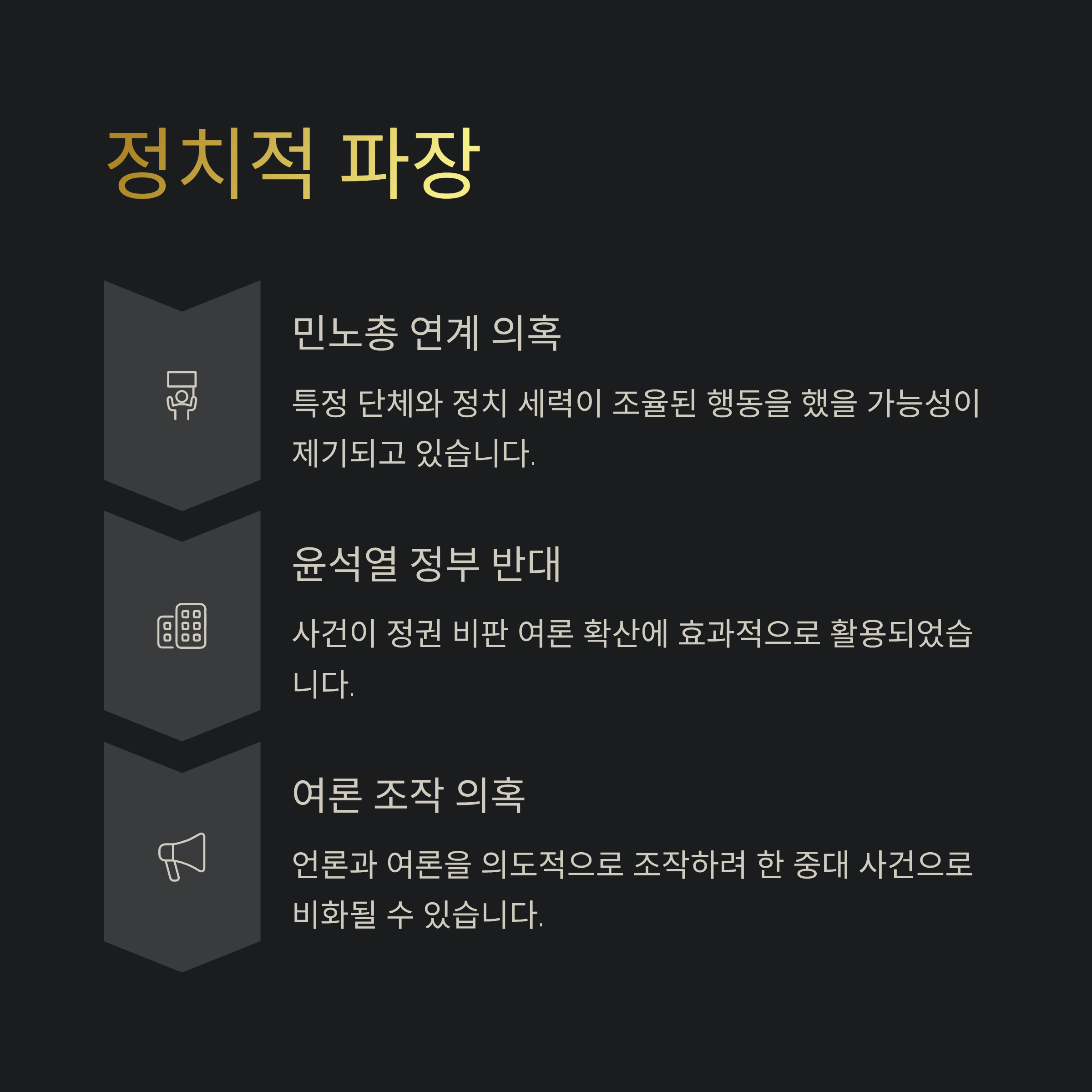 만약 민노총 등 특정 세력과 연계하여 사건을 사전에 기획했다는 의혹이 사실이라면, 이는 단순히 개인의 일탈을 넘어 언론과 여론을 의도적으로 조작하려 한 중대한 사건으로 비화될 수 있습니다.