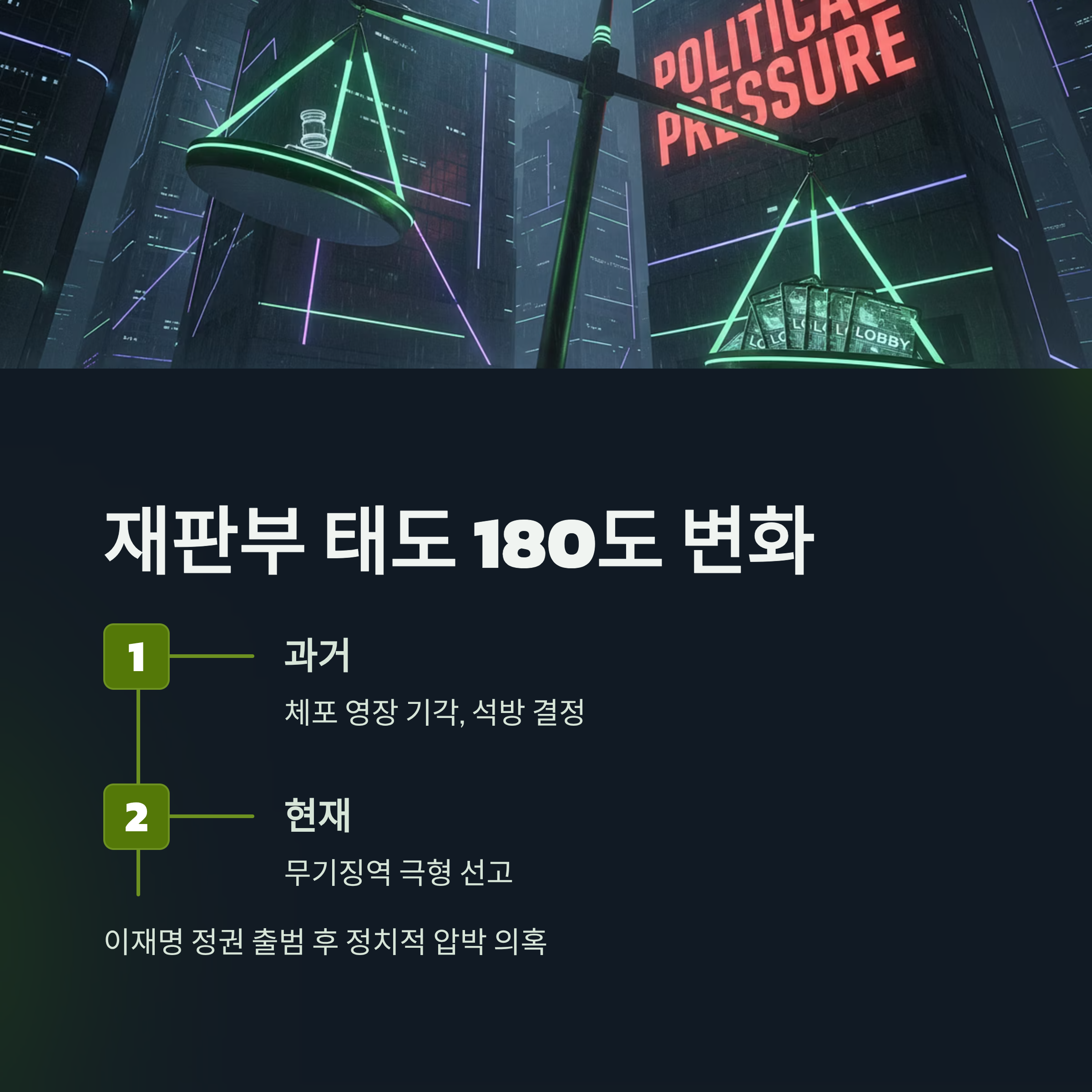 과거 체포 동의안을 기각했던 재판부가 중형을 선고한 배경에는 이재명 정권의 정치적 압박이 작용했다는 의혹이 제기됩니다.