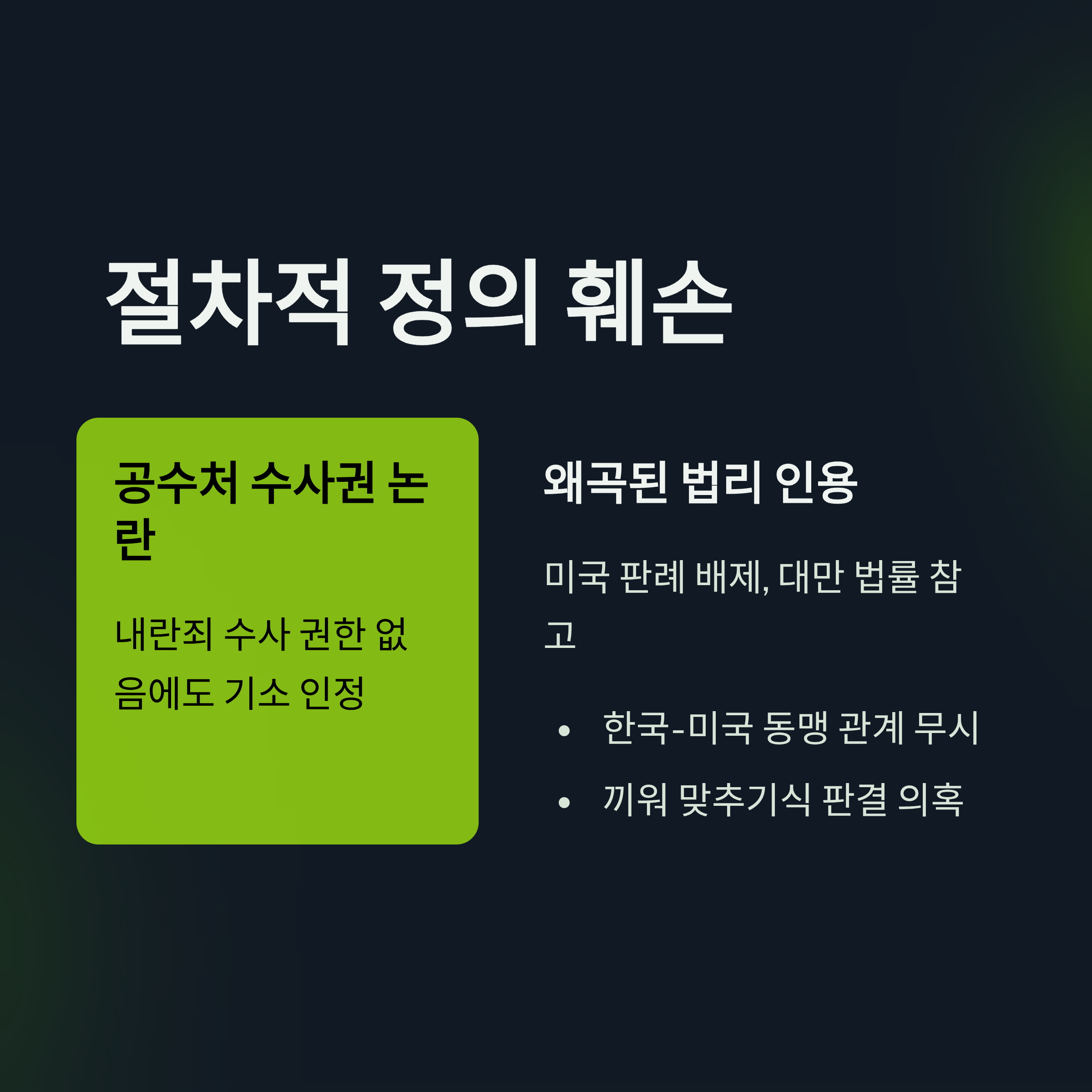내란죄 수사 권한이 없는 공수처의 기소를 인정하고, 법체계가 다른 대만 법률을 참고한 점은 절차적 정의를 훼손한 것입니다.