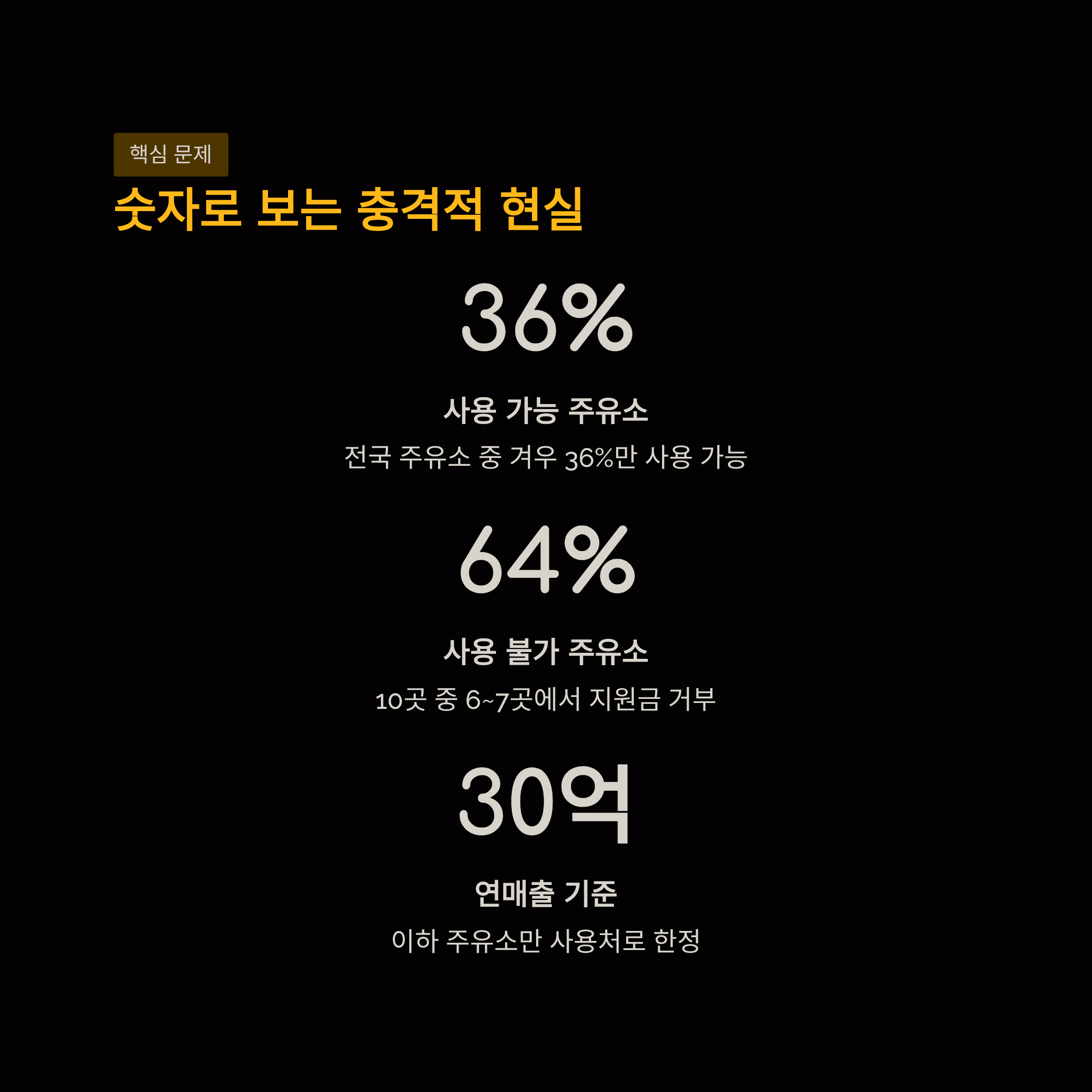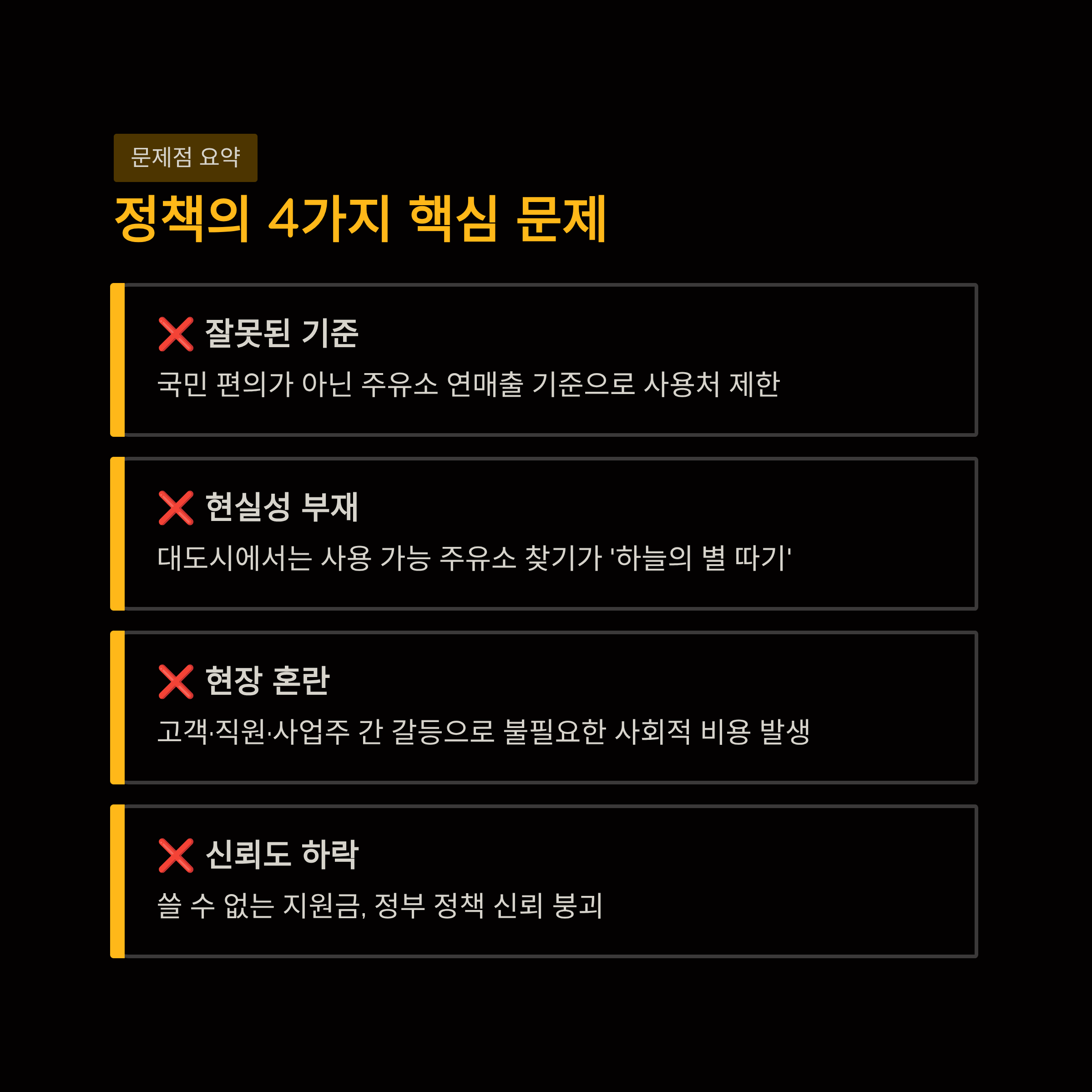 잘못된 기준 설정: 국민 편의가 아닌 '주유소 연매출'을 기준으로 삼아 사용처를 대폭 제한했습니다.