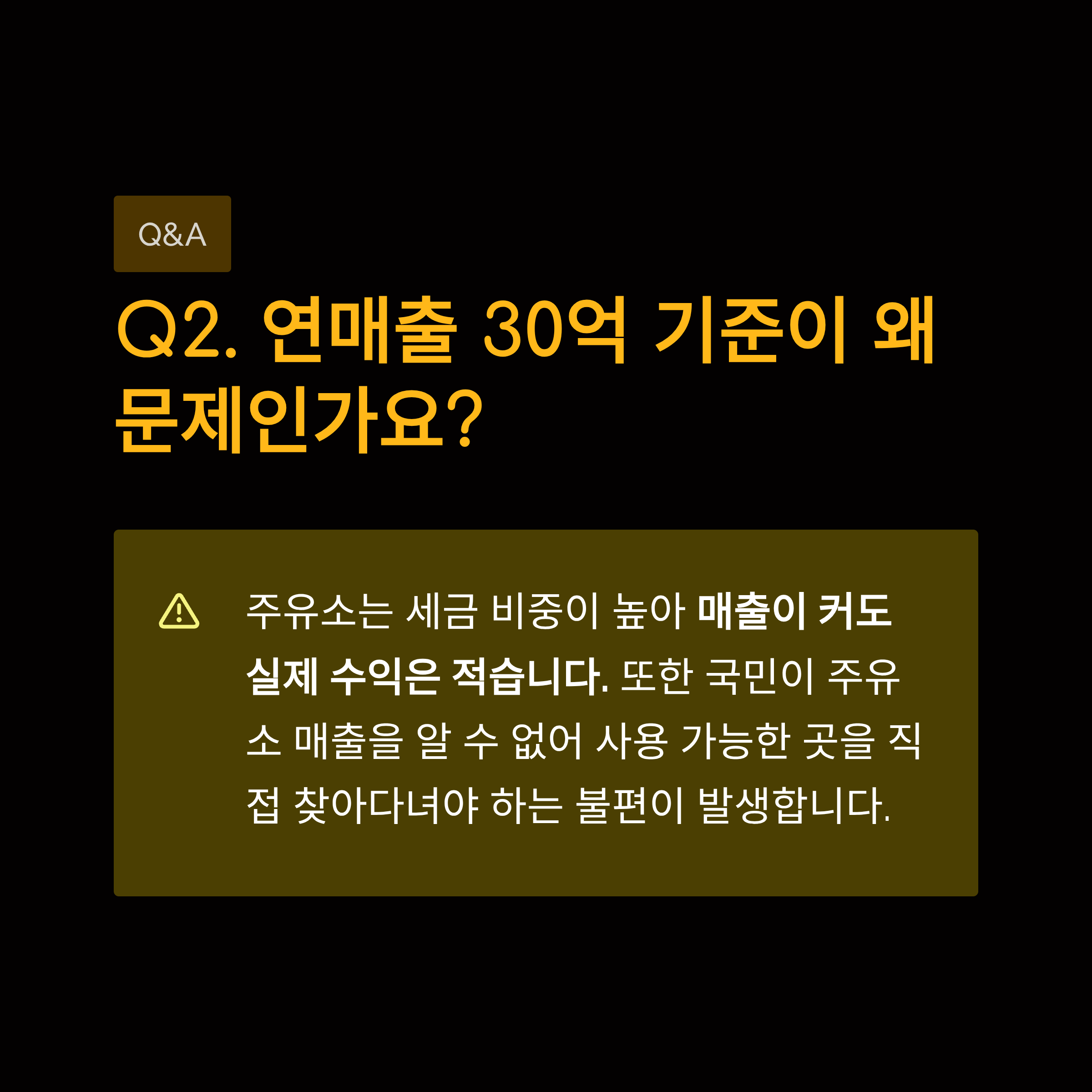 | A. 주유소는 세금 비중이 높아 매출이 커도 실제 수익은 적을 수 있어, 매출액 기준은 현실을 제대로 반영하지 못합니다. 또한, 국민이 주유소의 매출을 알 수 없어 사용 가능한 곳을 찾아다녀야 하는 큰 불편을 초래합니다. |