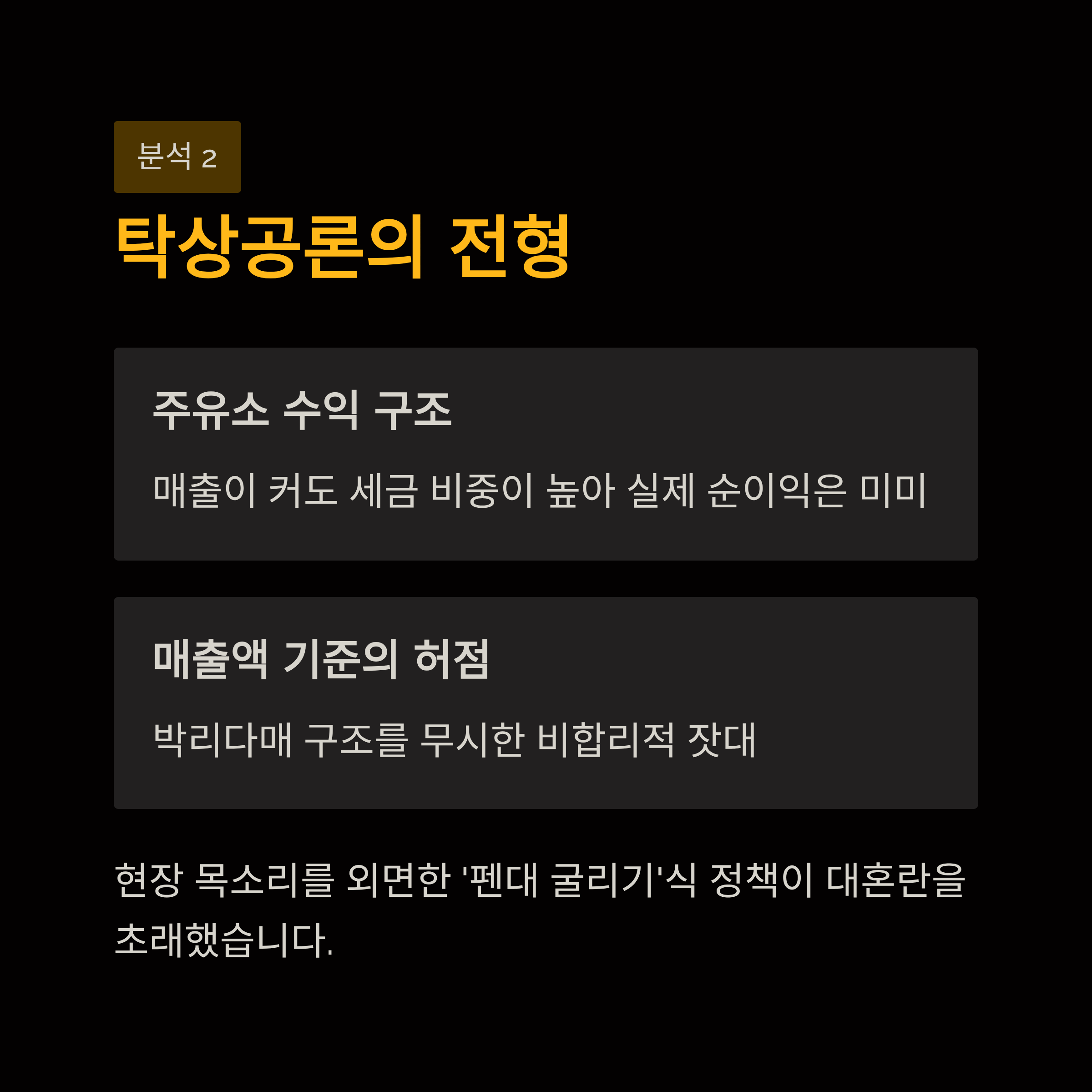 ‘연매출 30억 원’이라는 기준은 주유소 업계의 현실을 전혀 반영하지 못한 탁상공론의 산물입니다. 주유소는 매출액 규모가 크더라도 실제 수익은 높지 않은 박리다매 구조를 가지고 있습니다. 유류 가격의 상당 부분이 세금으로 구성되어 있어 매출이 높아도 주유소의 순이익은 미미할 수 있기 때문입니다. 즉, 매출액을 기준으로 지원 대상을 나누는 것은 주유소의 실제 경영 상태를 제대로 파악하지 못하고 설정한 비합리적인 잣대에 불과합니다. 이러한 정책 결정 과정은 현장의 목소리를 외면한 채 책상에 앉아 숫자만으로 정책을 만들 때 발생하는 전형적인 문제입니다. 정책 입안자들이 주유소의 수익 구조나 국민의 실제 주유 패턴에 대한 최소한의 이해만 있었더라도 이런 황당한 기준은 나오지 않았을 것입니다. 결국 현실을 모르는 ‘펜대 굴리기’식 정책이 현장의 대혼란을 초래했으며, 이는 정부가 국민을 위한다며 내놓은 정책이 오히려 국민의 불편을 가중시키는 아이러니한 결과를 낳았습니다.