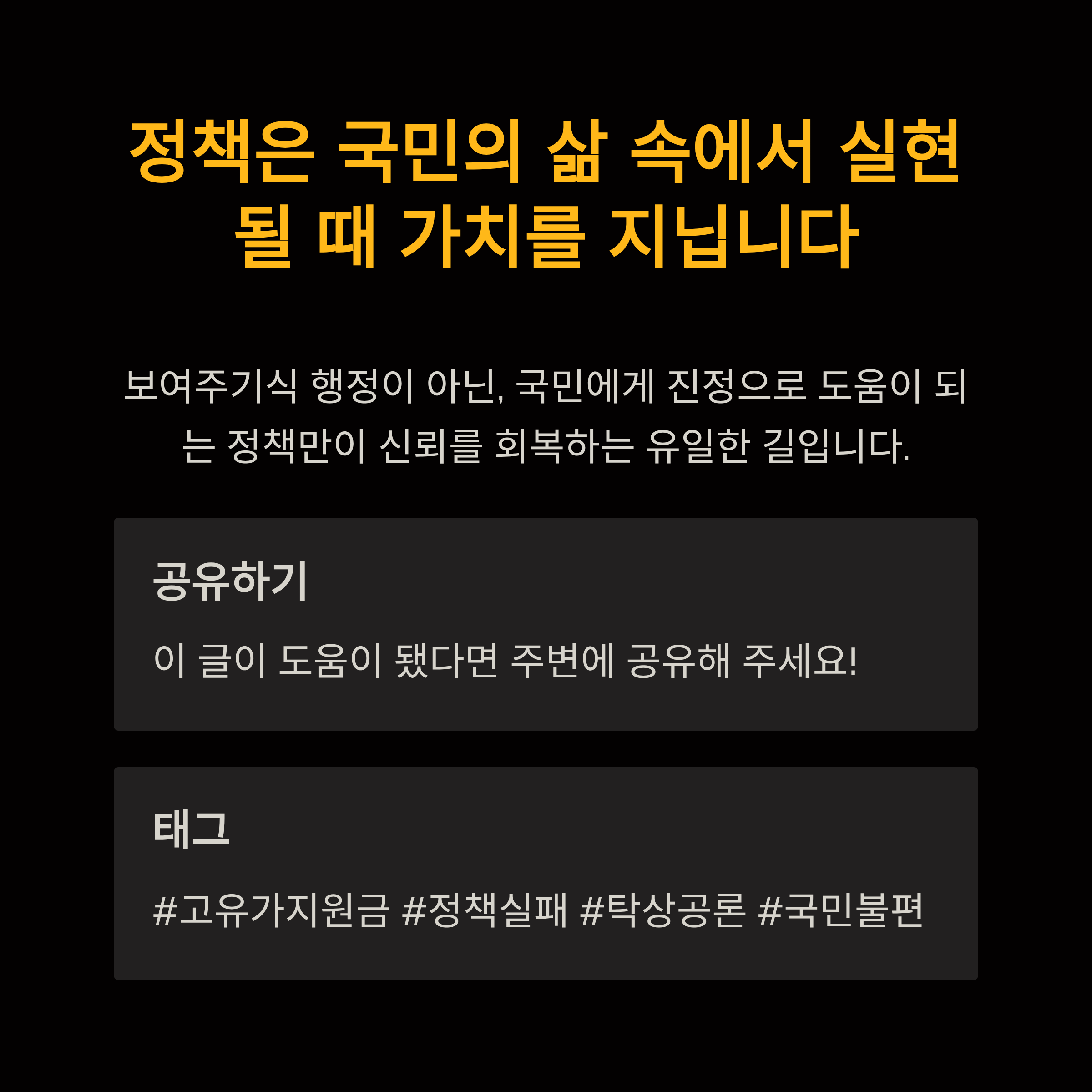 잘못 설계된 정책은 예외 없이 현장의 혼란과 불신을 야기합니다. 현재 주유소 현장에서는 "왜 여기는 지원금 사용이 안 되냐"고 항의하는 고객과 "저희도 잘 모르겠다"며 응대하는 직원, "왜 우리는 대상에서 제외되냐"고 불만을 토로하는 주유소 사업주 사이에 갈등이 증폭되고 있습니다. ‘고유가 지원금’이라는 이름만 믿고 주유소를 찾았던 국민들은 여러 곳을 헤매야 하는 불편을 겪으며 정책에 대한 깊은 실망감을 느끼고 있습니다. 이러한 상황은 단순히 일시적인 불편에서 그치지 않고, 정부 정책 전반에 대한 신뢰도 하락으로 이어집니다. 국민을 돕겠다며 만든 정책이 오히려 국민을 괴롭히고, 지원금이라는 이름이 무색하게 정작 필요할 때 쓸 수 없는 모순적인 상황은 정책의 존재 이유를 무의미하게 만듭니다. 결국 이번 사태는 선심성 정책을 급조하여 무리하게 시행한 ‘보여주기식 행정’의 민낯을 드러낸 셈이며, 정책 효과는 미미한 채 국민 불편, 현장 혼란, 신뢰도 하락이라는 총체적 난국만 초래했습니다.