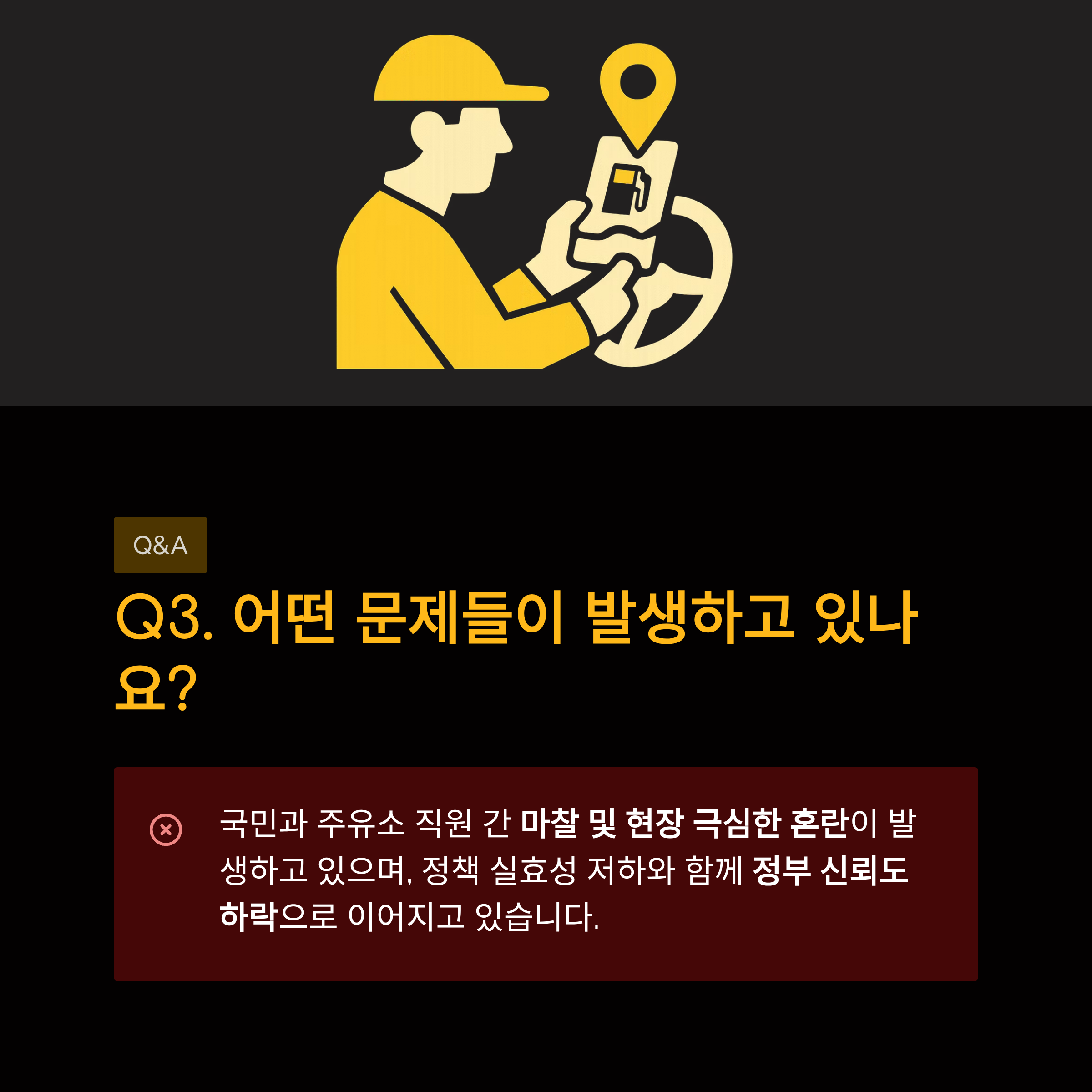 현장 혼란 가중: 사용 가능 주유소를 모르는 국민과 직원들 간의 갈등으로 불필요한 사회적 비용이 발생하고 있습니다.