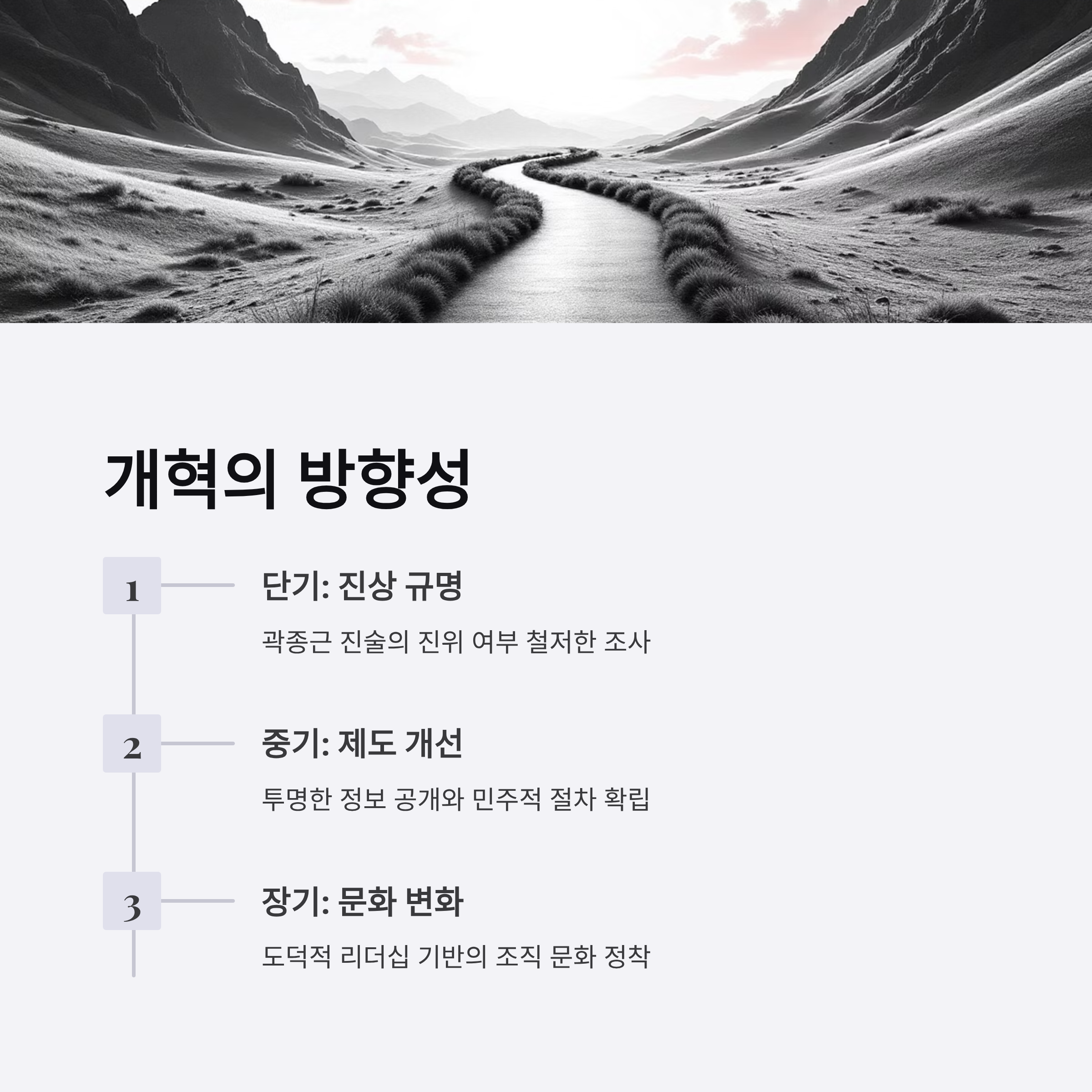 군 조직은 국민의 신뢰를 기반으로 그 기능을 다합니다. 하지만 이번 사건으로 인해 군 내부의 신뢰가 약화되면서 개혁 논의가 활발히 진행되고 있습니다. 전문가들은 군 내부 감사와 함께 전술적 명령 집행 과정의 투명성을 강화하는 것이 필수적이라는 점을 강조합니다. 이는 단순한 시스템 변화가 아니라, 군 조직의 가치와 문화를 재확립하는 장기적 노력이 필요함을 의미합니다.