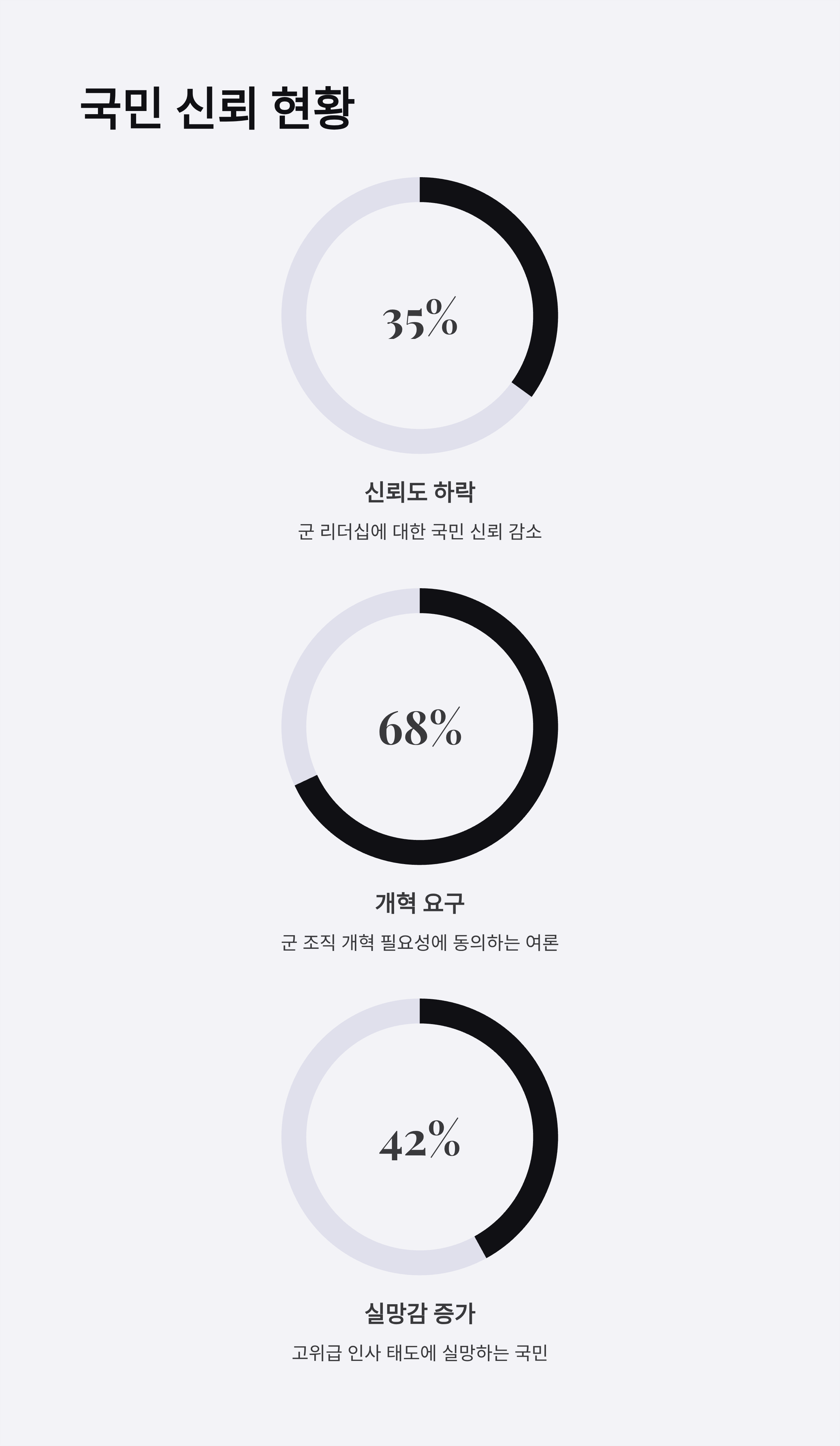 | A. 군의 책임감 부족과 일부 고위급 인사의 태도에서 실망감을 느끼는 국민들이 늘어나고 있습니다. 이는 곧 군 개혁 요구와 신뢰 확보 체계 강화의 목소리로 이어지고 있습니다. |
