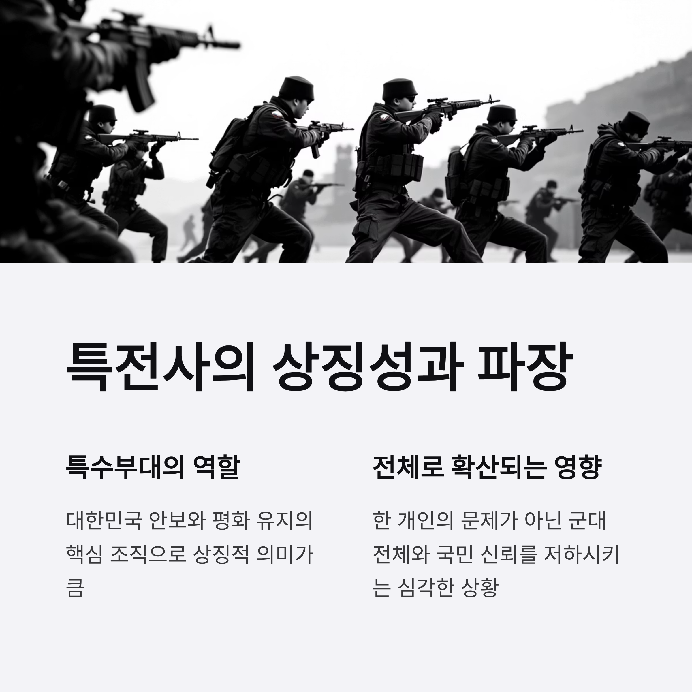 | A. 이번 사건으로 인해 군 리더십에 대한 의혹과 도덕적 신뢰가 많이 감소했습니다. 특전사 등 특정 부대의 이미지에도 부정적인 영향을 주었으며, 군 내부 기강 유지의 필요성이 재조명되고 있습니다. |