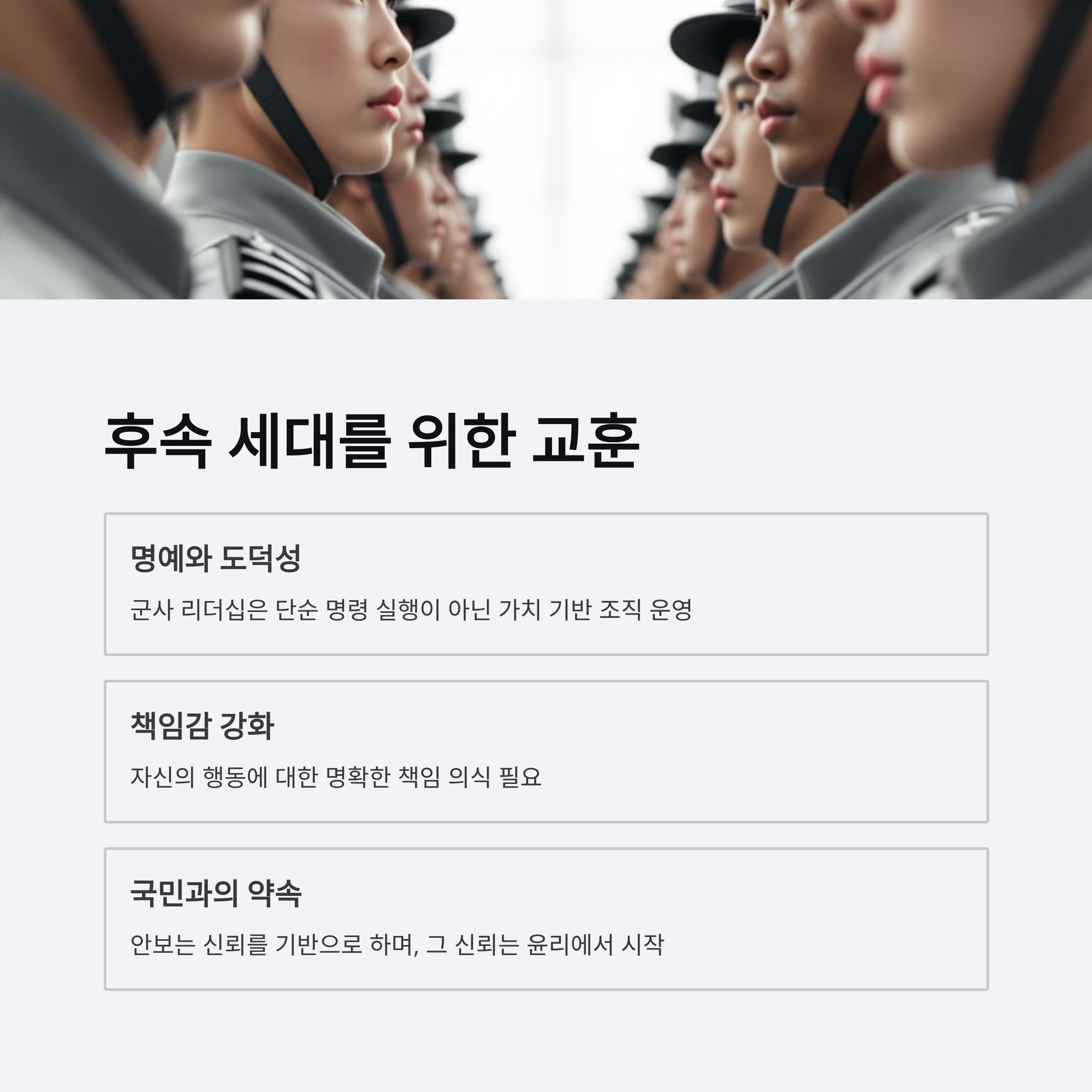 군인의 도덕성과 윤리성 강화는 국민 신뢰의 회복을 위해 가장 중요한 과제입니다.