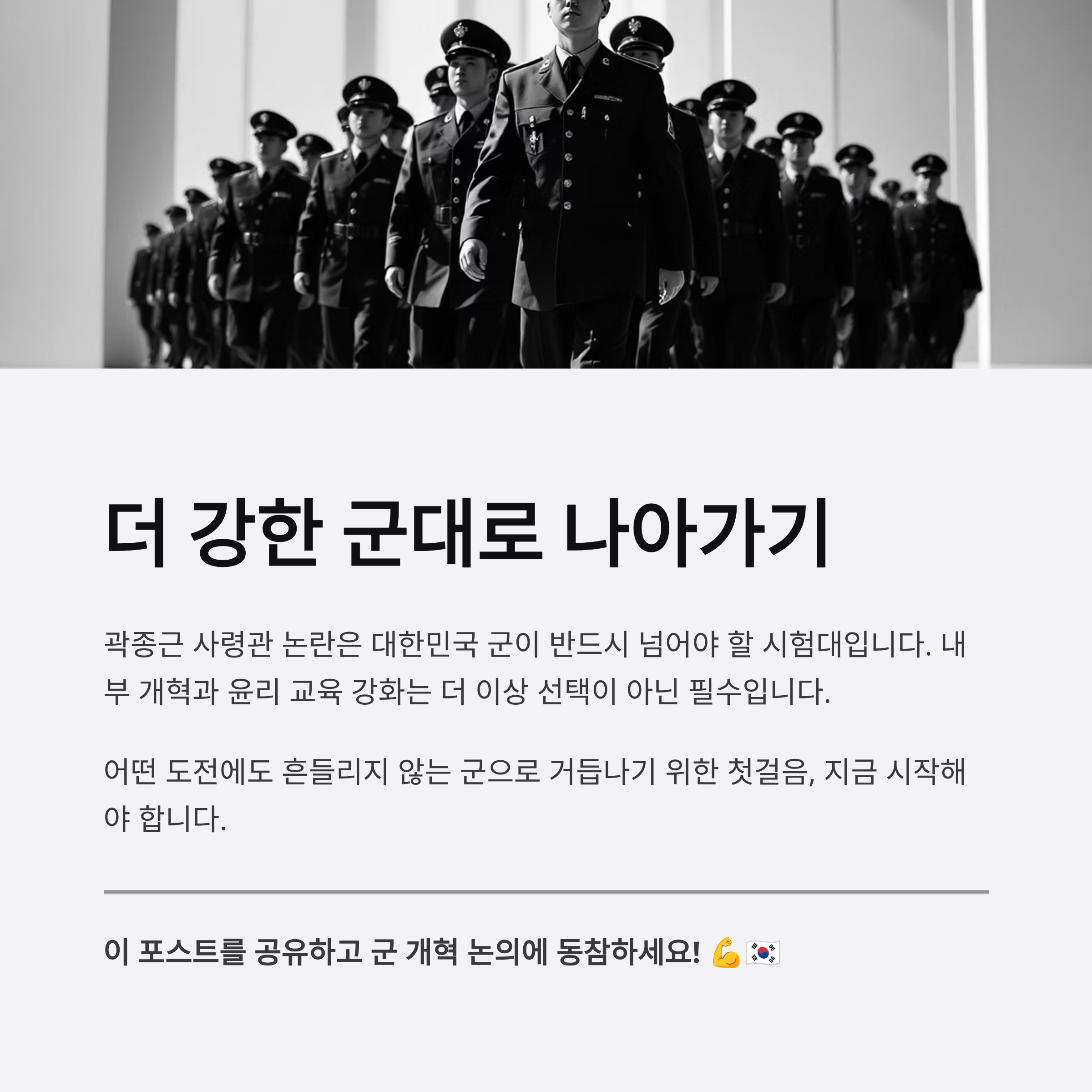 따라서 군 내부의 진상 규명과 제도적 강화는 더 나은 국민 안보와 국제적 위상 강화를 위한 필연적인 과정으로 삼아야 합니다.