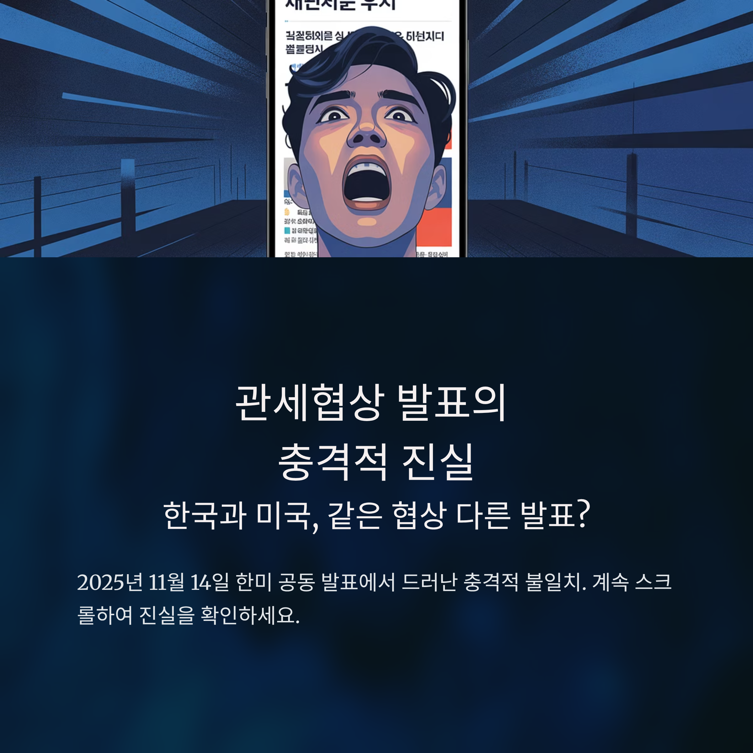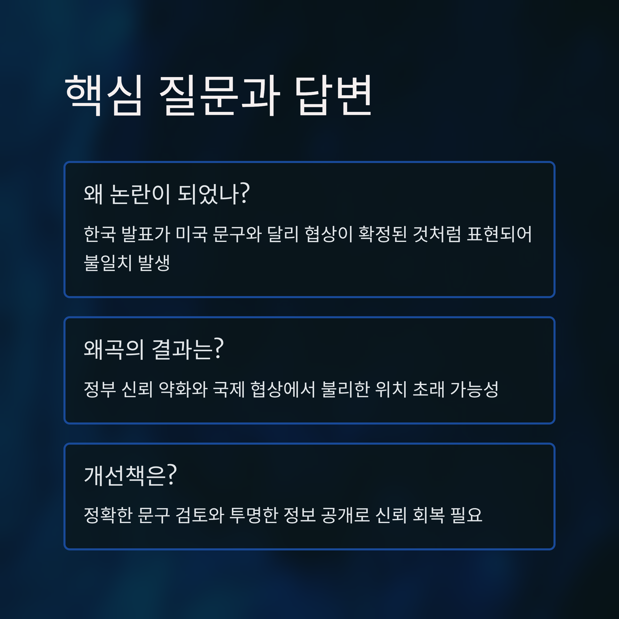| A. 한국 발표는 미국 측 문구와 다르게 표현되어 협상이 이미 확정된 것처럼 발표되었습니다. 이로 인해 실제 내용과의 불일치가 문제가 되었습니다. |