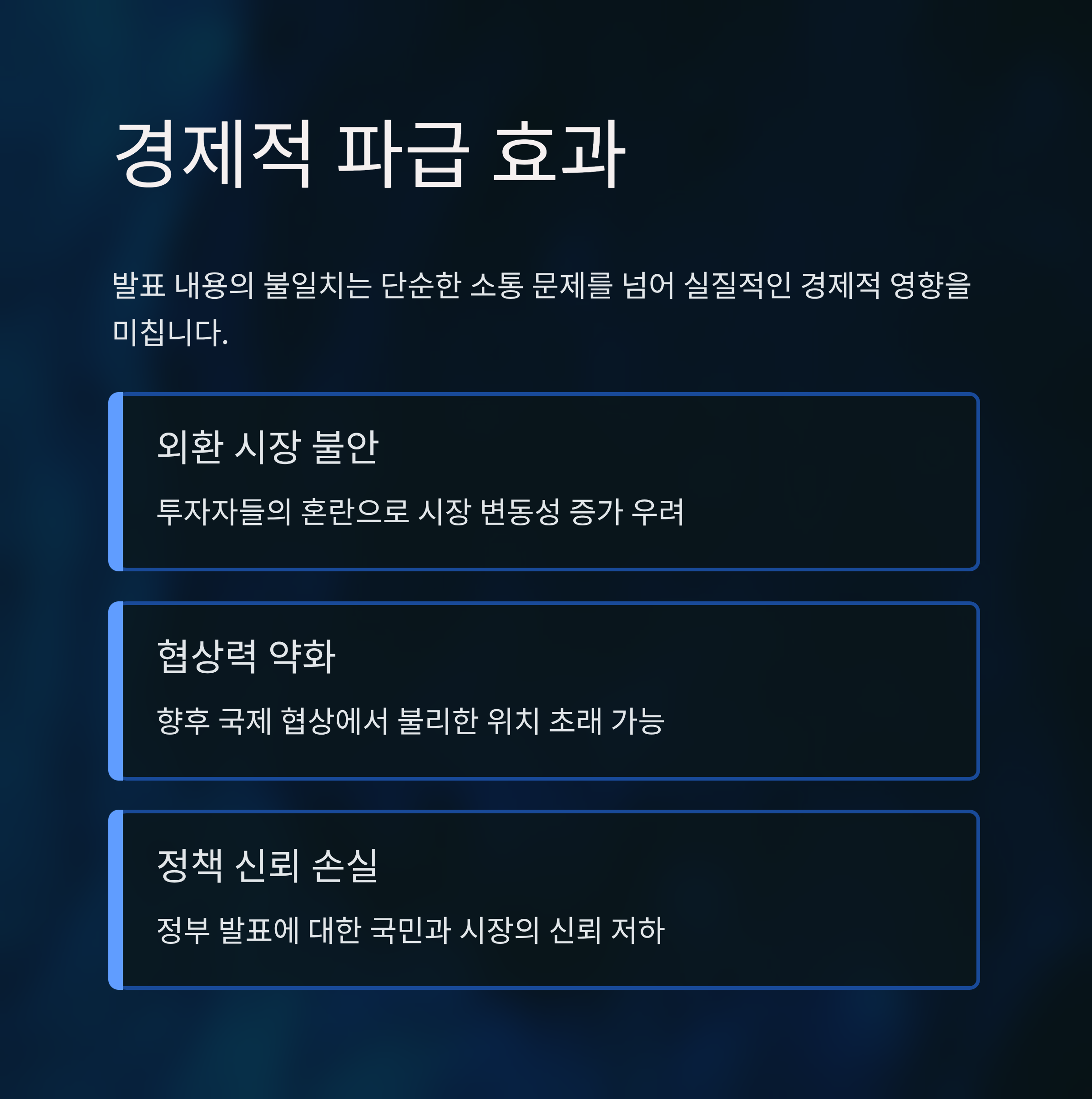 이와 같은 발표 문제는 국내외적으로 큰 파장을 불러일으킬 가능성이 큽니다. 국내 여론은 부정확한 정보 제공으로 혼란을 겪게 되고, 국제 협상 파트너들에게는 “한국 정부 발표는 신뢰하기 어렵다”는 인상을 줄 위험이 있습니다. 이는 향후 한국의 대외 협상력 약화로 이어질 가능성마저 있음을 보여줍니다.