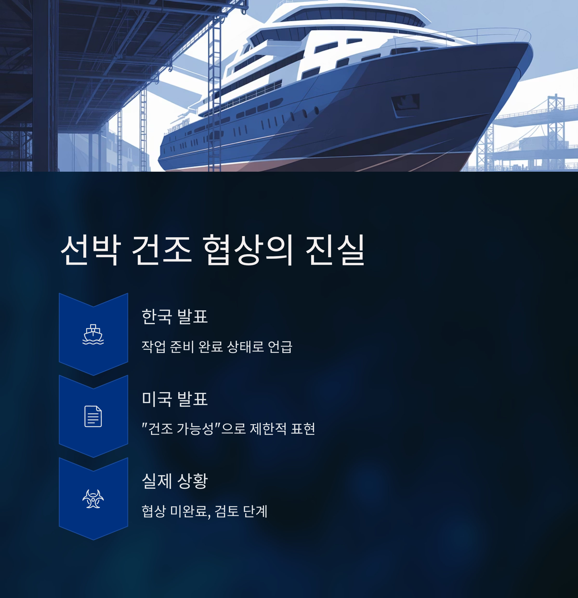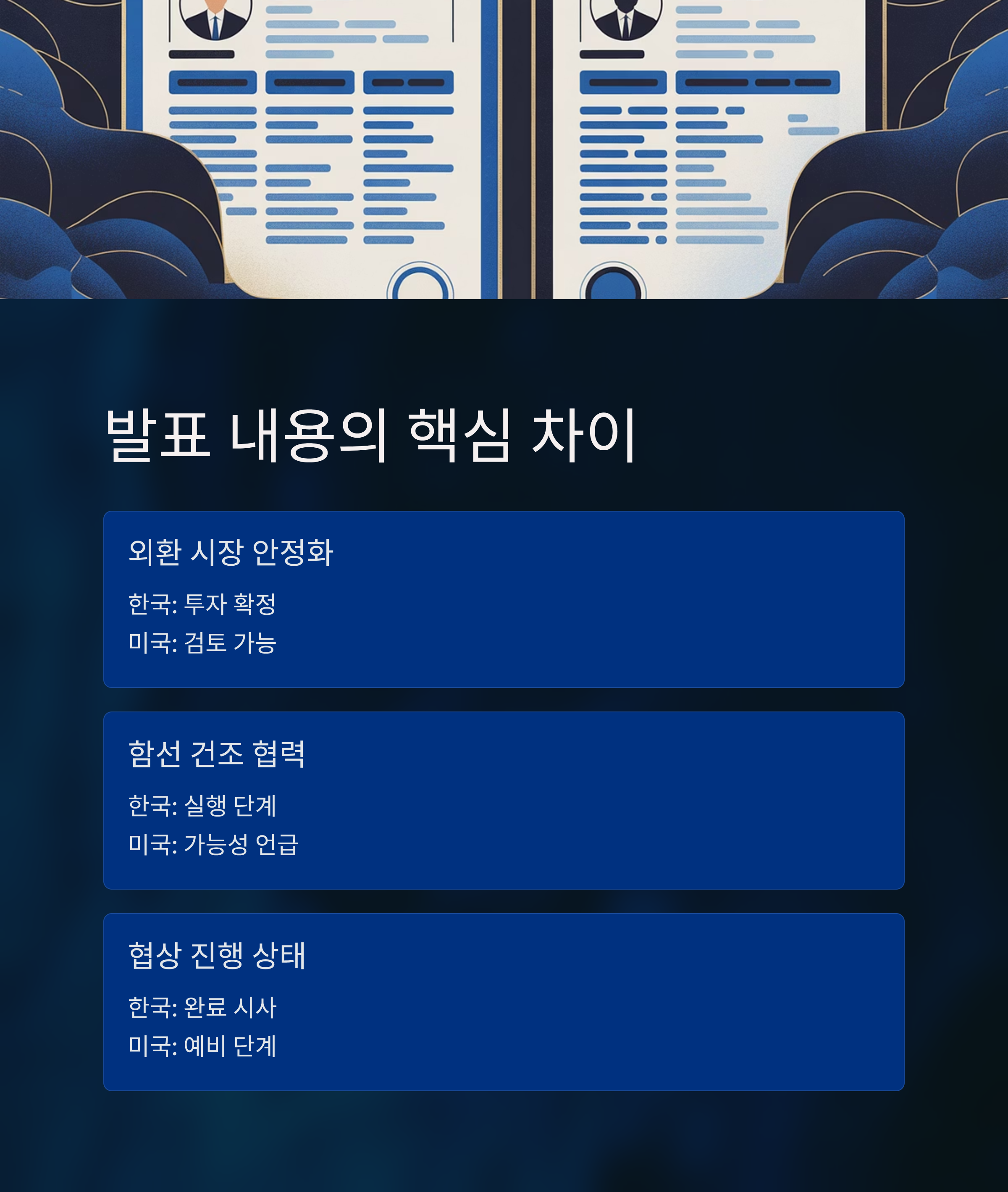 - 함선 건조: 한국 발표는 실행 단계처럼 언급했으나 미국 발표는 "가능성"에 그침.