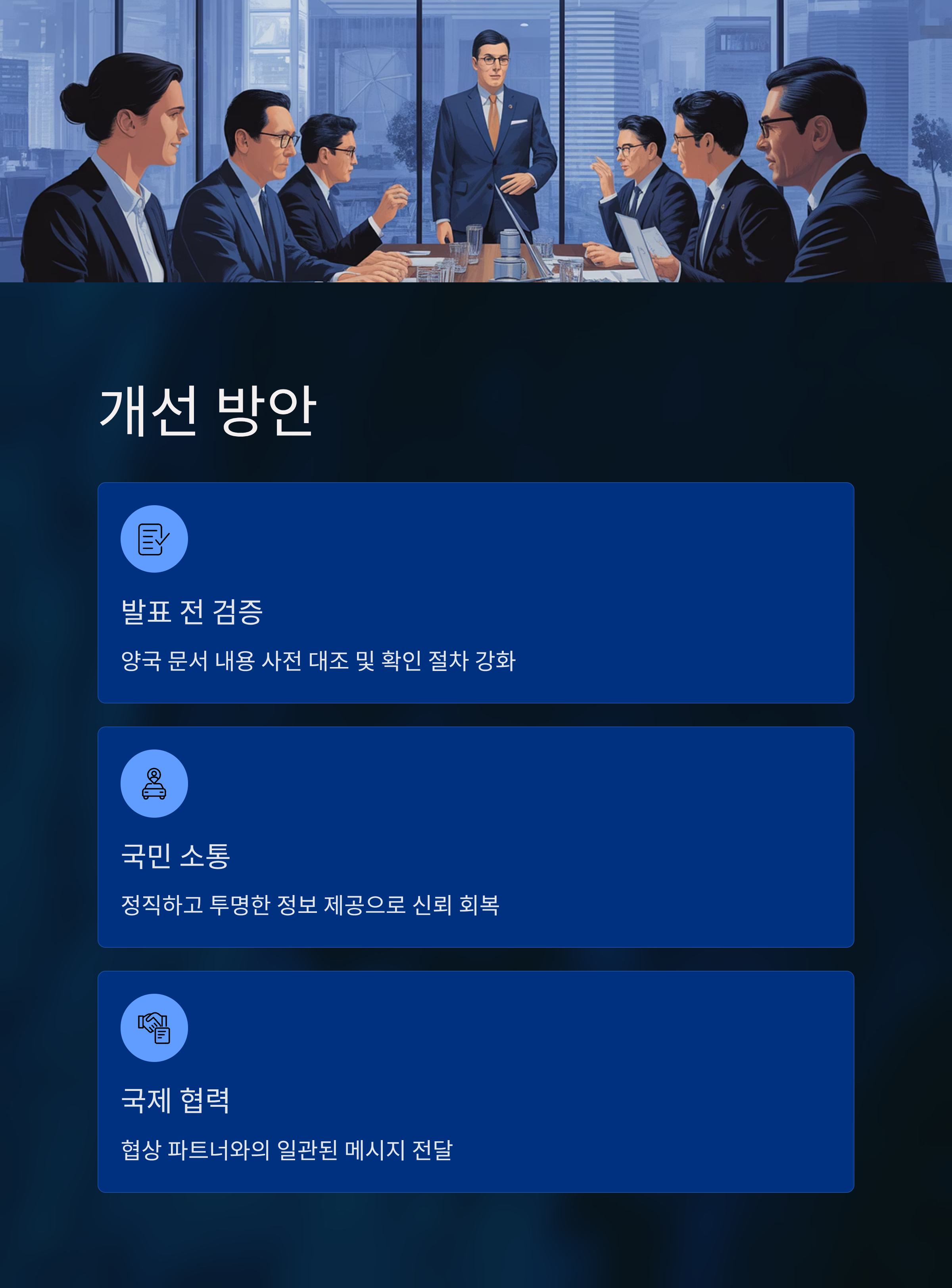 이번 논란에서 드러난 발표 내용의 불일치는 정책 발표의 투명성과 정확성이 얼마나 중요한지 보여줍니다. 정부는 국민을 향한 정보 제공에서 신뢰와 정직을 최우선으로 삼아야 하며, 국제 협상에서도 동일한 자세가 요구됩니다.
