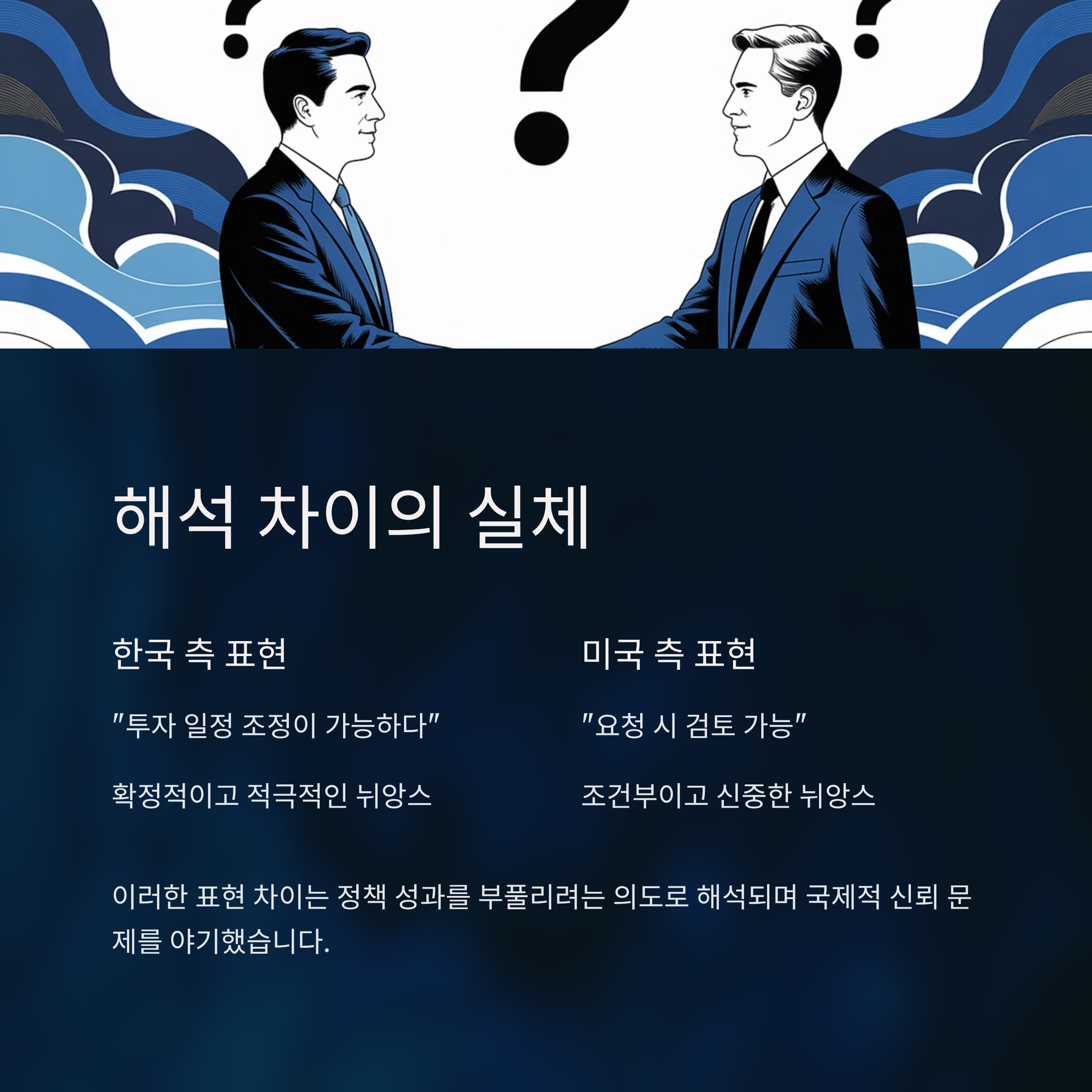 이번 논란의 핵심은 발표된 자료의 해석 차이에서 비롯되었습니다. 한국 측은 “투자 일정 조정이 가능하다”고 발표했으나, 미국 측 공식 자료에는 “요청 시 검토 가능”이란 문구를 사용했습니다. 이는 두 발표가 실질적으로 내용이 다르다는 것을 나타내며, 정책성과를 부풀리려는 의도가 있었던 것으로 보입니다. 이러한 차이는 국제적 협상을 바라보는 한국 정부의 접근 방식에서 신뢰 문제가 제기되도록 만들었습니다.