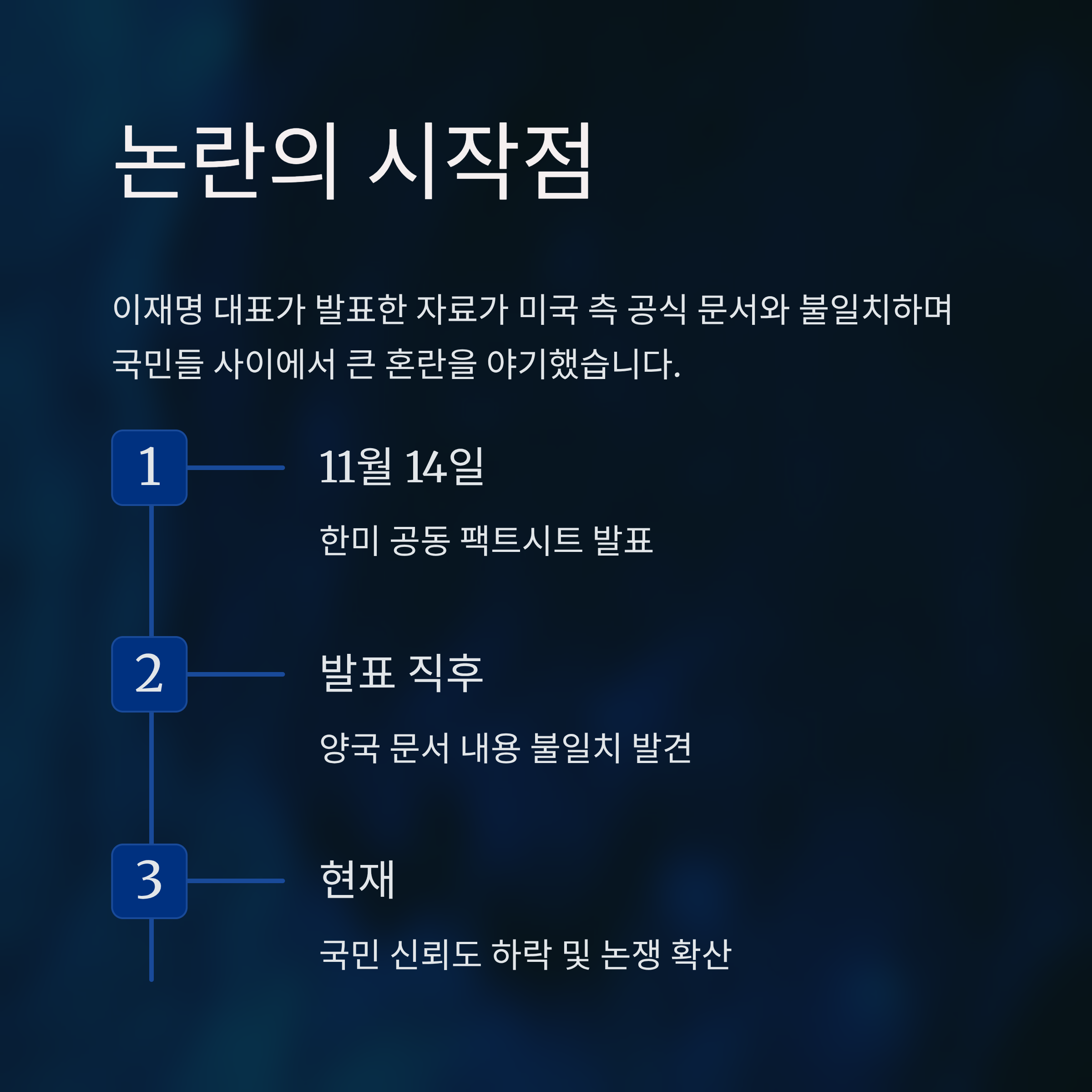 2025년 11월 14일, 한국과 미국은 새로운 경제 협력 계획과 관련된 공동 팩트시트를 발표했습니다. 이는 양국 간의 경제적 동맹을 공고히 하려는 목적에서 추진된 것입니다. 하지만 발표 내용이 양국 간 격차를 보이며 크고 작은 실망과 혼란을 유발하고 있습니다. 특히 이재명 대표가 발표한 자료가 미국 측 공식 문서와 불일치하며, 국민들 사이에서 큰 논란을 낳고 있습니다.