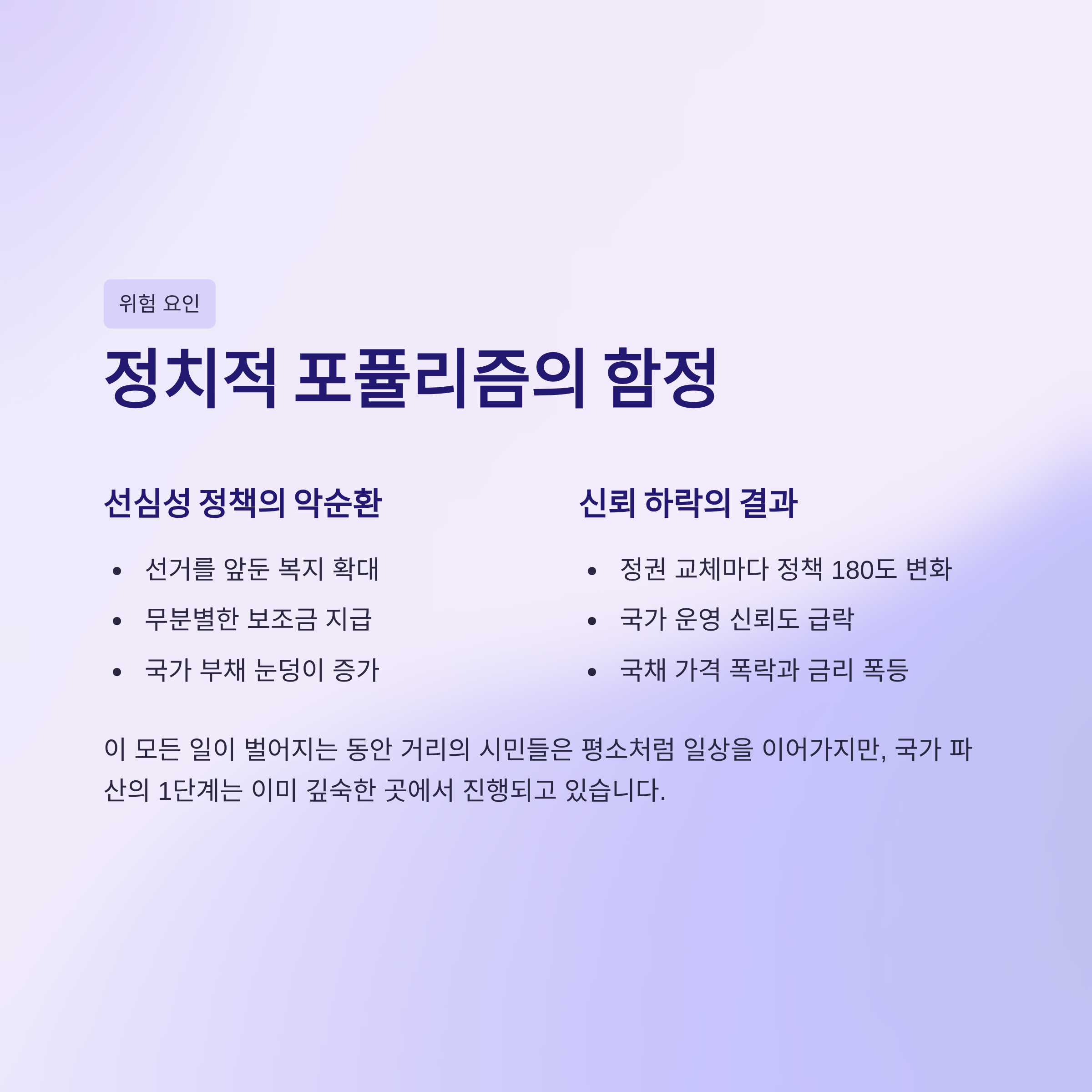국가 파산은 ATM 화면의 오류 메시지에서 시작해 사회 전체의 마비로 끝나는, 단계적이고 파괴적인 과정입니다. 그 근본 원인은 '신용의 붕괴'이며, 이는 재정 건전성을 무시하고 부채에 의존한 경제 운영의 필연적 결과입니다. 국제 금융 시장에서 신용을 잃는 순간, 환율과 물가라는 가장 날카로운 칼날이 국민의 지갑과 자산을 겨누기 시작합니다. 평범한 개인은 자신의 월급과 예금 가치가 하루아침에 증발하는 끔찍한 경험을 하게 되고, 이는 뱅크런과 시스템 마비, 사회 질서 붕괴라는 최악의 시나리오로 이어집니다.