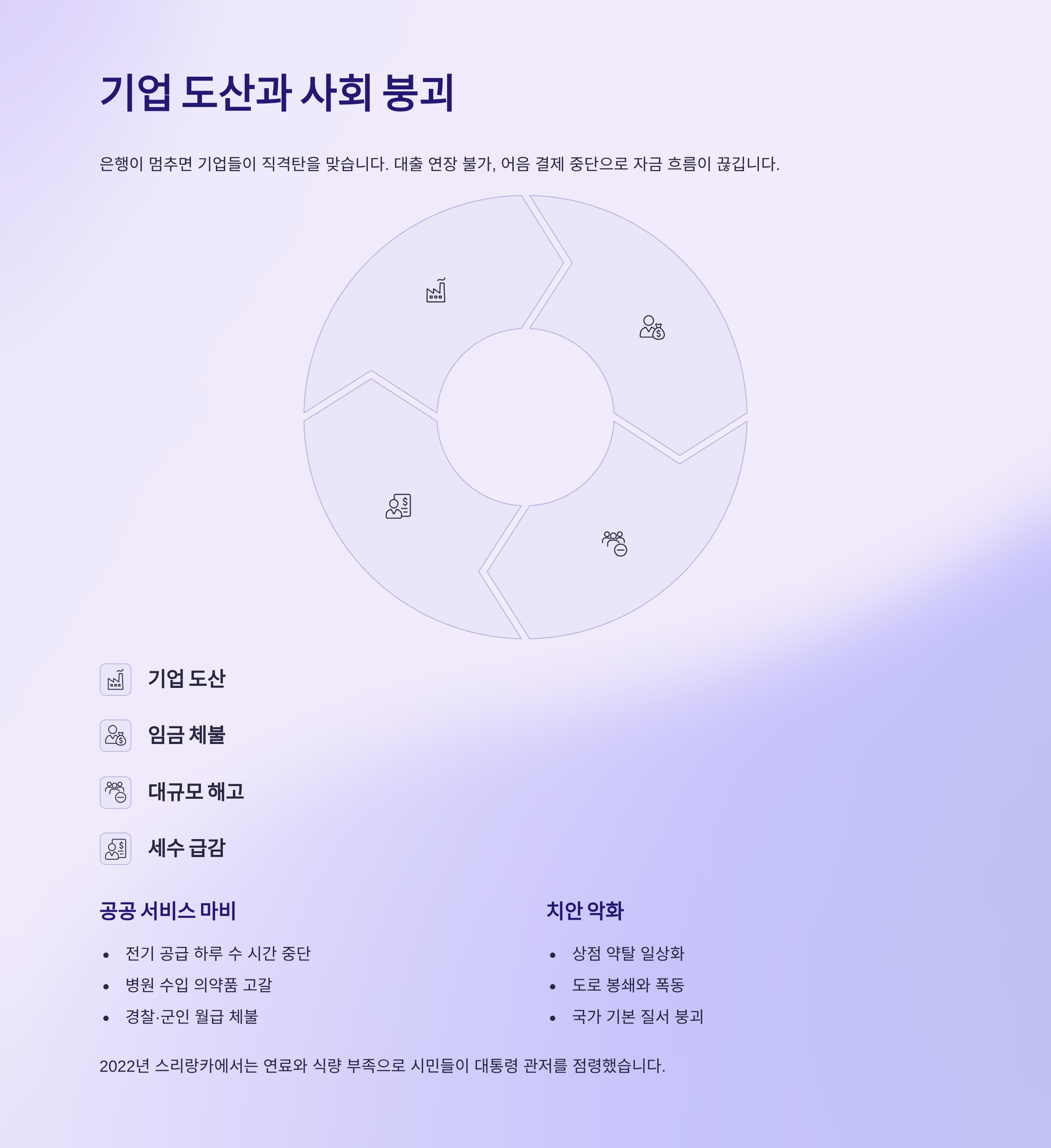은행이 멈추면 기업들이 직격탄을 맞습니다. 대출 연장이 막히고 어음 결제가 불가능해지면서 자금 흐름이 끊긴 기업들은 직원들의 월급조차 지급할 수 없게 됩니다. 이는 곧 기업 도산, 임금 체불, 대규모 해고로 이어져 실업률을 급등시킵니다. 세수가 급감한 정부는 공공 서비스를 유지할 동력을 잃습니다. 전기 공급이 하루 수 시간씩 끊기고, 병원에는 수입 의약품이 떨어지며, 경찰과 군인조차 월급을 제때 받지 못해 치안은 악화됩니다. 2022년 스리랑카에서는 연료와 식량 부족으로 폭동이 일어나 시민들이 대통령 관저를 점령했고, 상점 약탈과 도로 봉쇄가 일상이 되었습니다. 숫자로만 보던 경제 위기가 집 앞 골목과 병원, 마트의 풍경을 바꾸고 국가의 기본 질서마저 무너뜨리는, 국가 파산의 마지막 단계입니다.