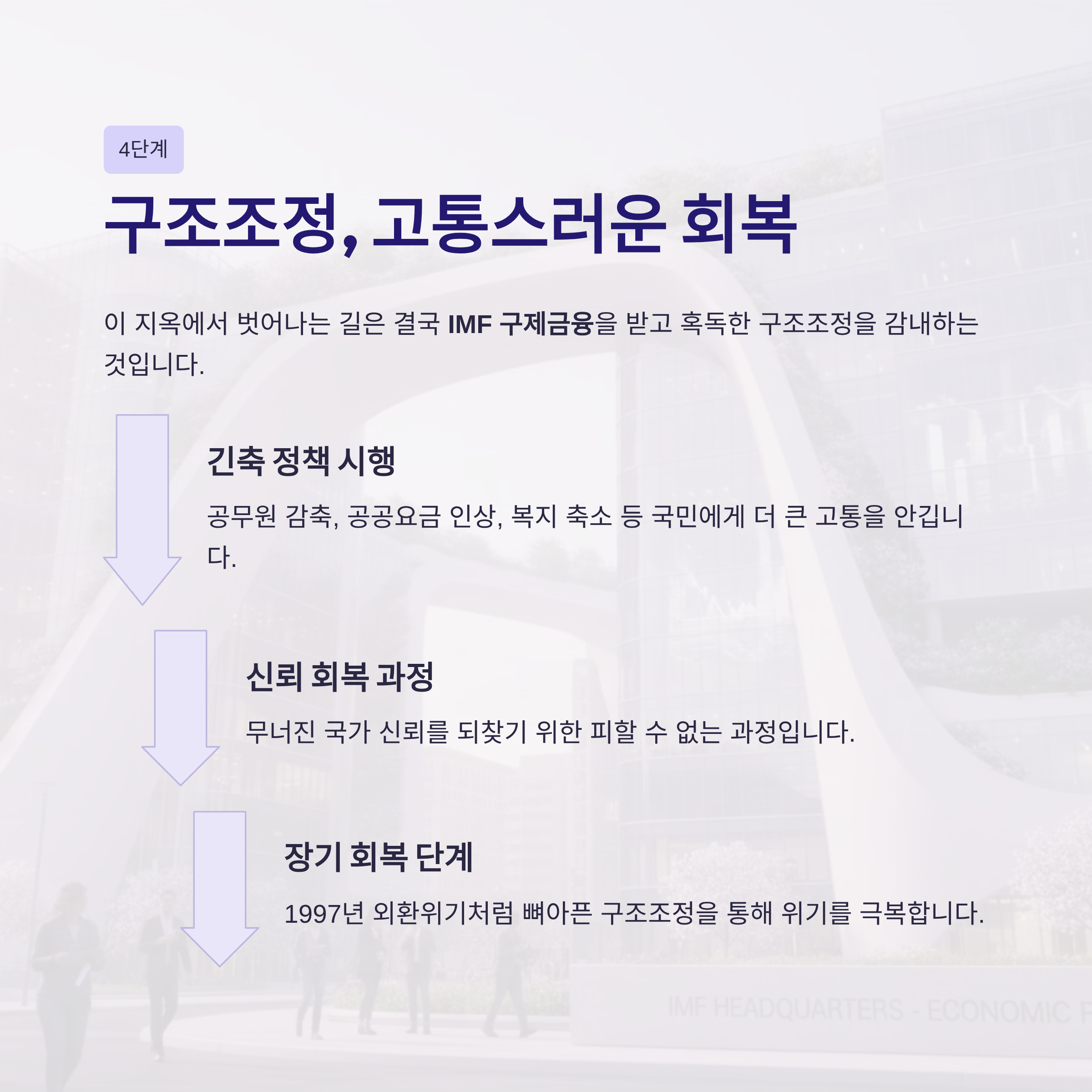 최종적으로 4단계에서는 IMF 구제금융의 대가로 고통스러운 구조조정과 긴축 정책을 통해漫長한 회복 과정에 들어갑니다.