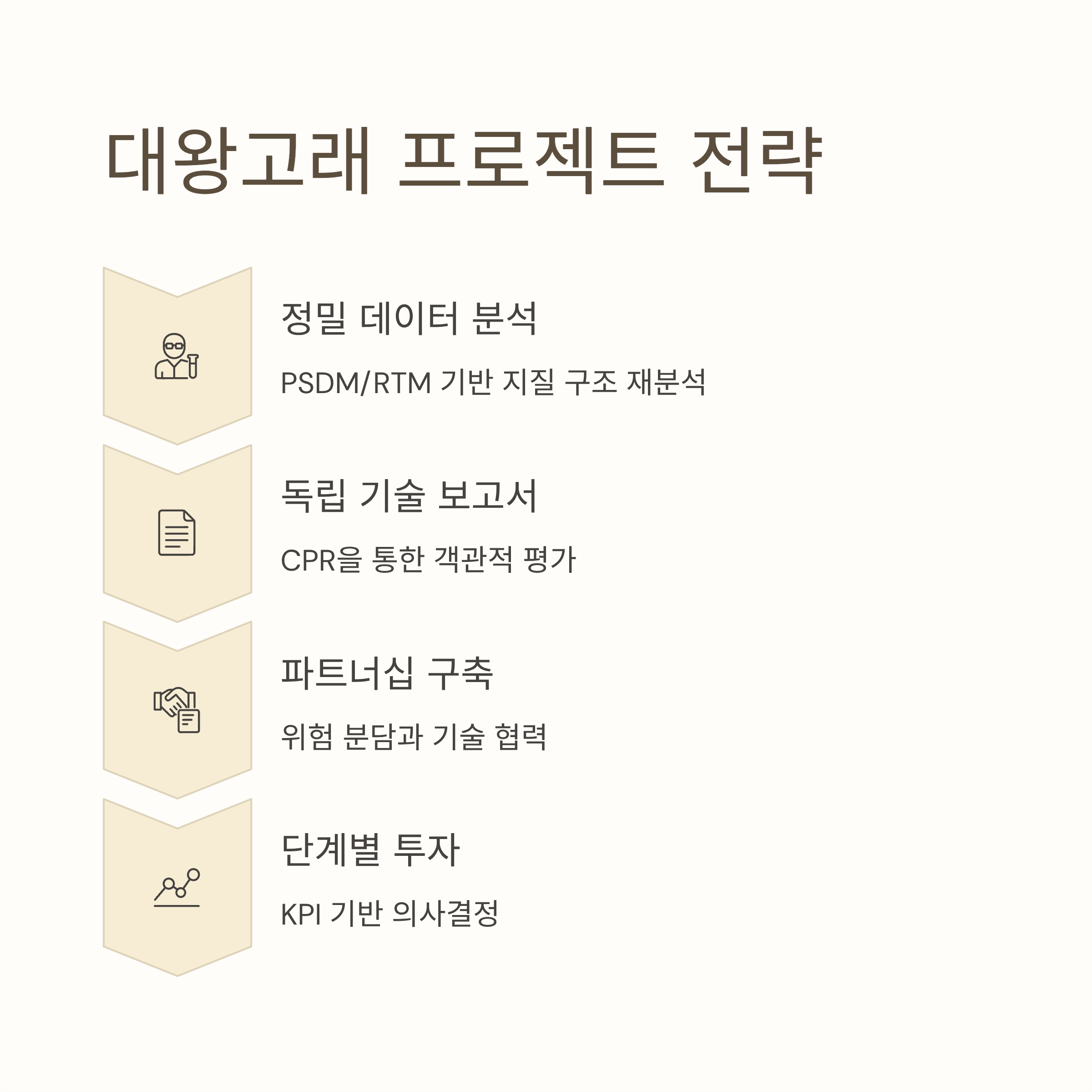 탐사-개발-생산까지 이어지는 스테이지 게이트 시스템 도입도 중요합니다. 정량 KPI를 설정하고 각 단계의 진척에 따라 투자 의사결정을 조건부로 진행하면, 국민적 신뢰를 높이면서도 효율적인 개발이 가능합니다.