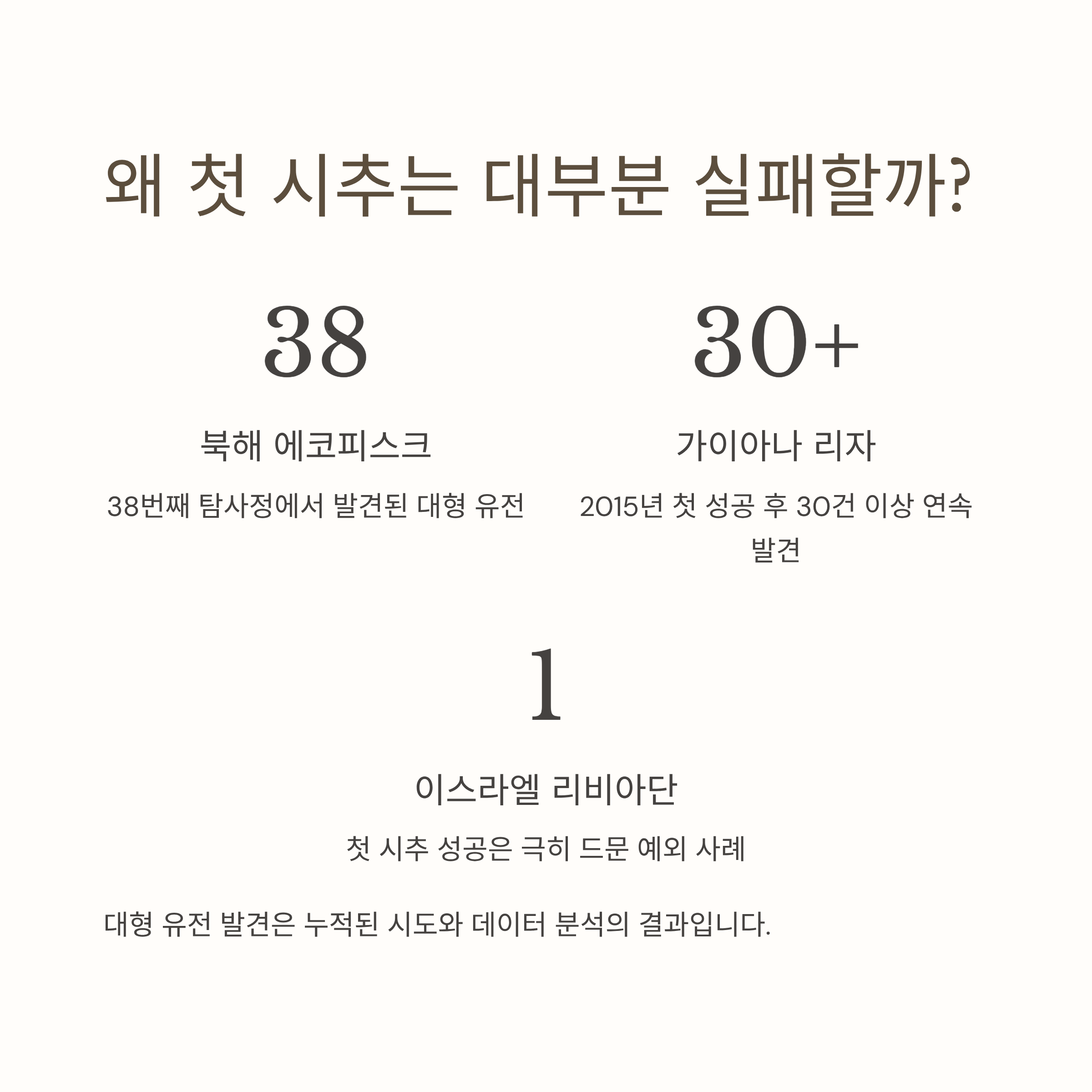 노르웨이 북해 에코피스크 유전은 첫 시추에서 발견된 것이 아닙니다. 실제로 노르웨이 섹터 내 38번째 탐사정, 북해 전체로는 수백 번째 시도 끝에 이뤄진 대발견입니다. 단일 시추가 아닌 반복된 도전의 결과물이었던 셈입니다. 이 사례는 전 세계 석유개발 전문가들이 "첫 공은 실패해도 괜찮다"고 말하는 대표적인 이유입니다.