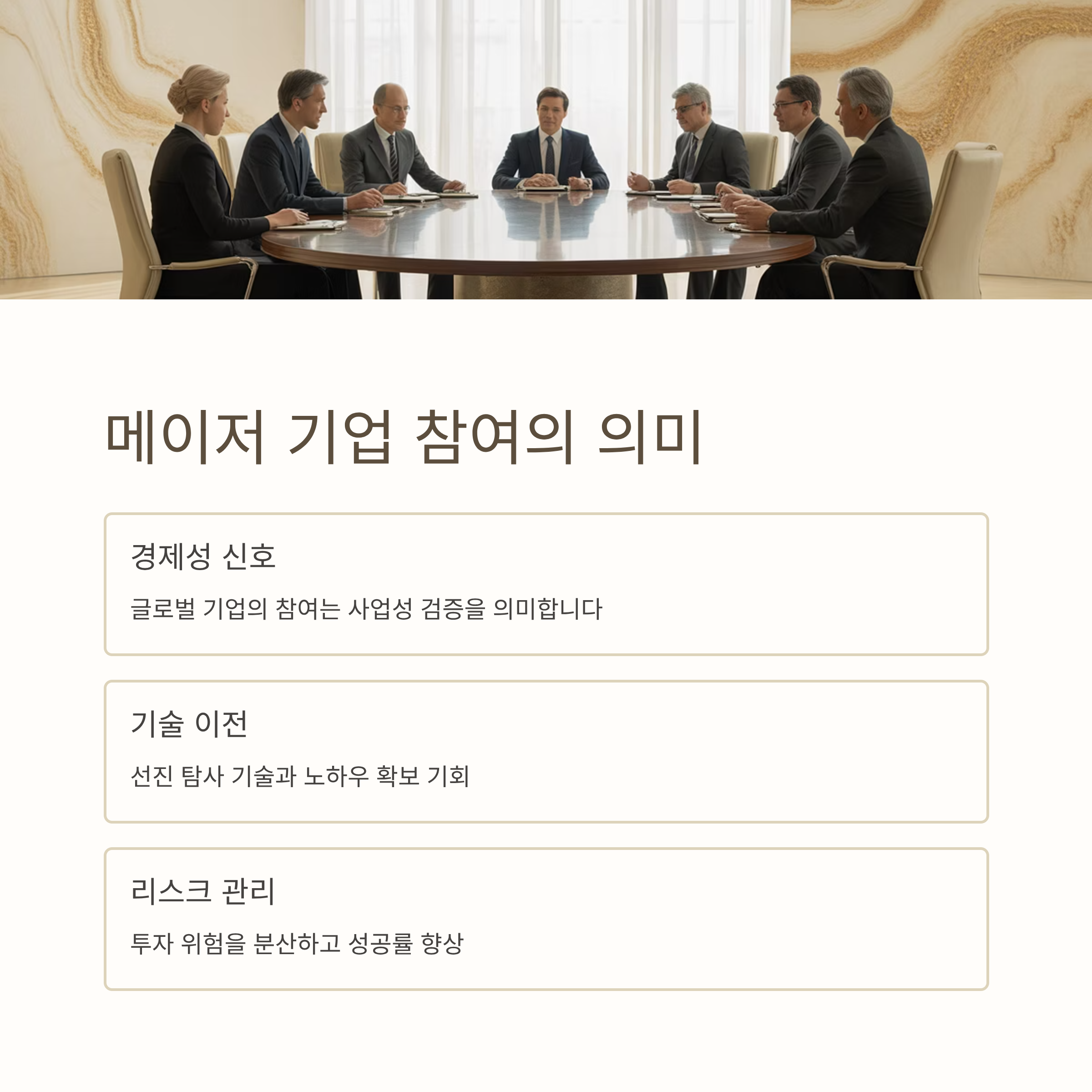 외국 메이저의 참여는 기술, 자본, 경험 면에서 탐사의 신뢰도를 높여줍니다. 이 자체가 가능성에 대한 시장의 신호로 해석됩니다.