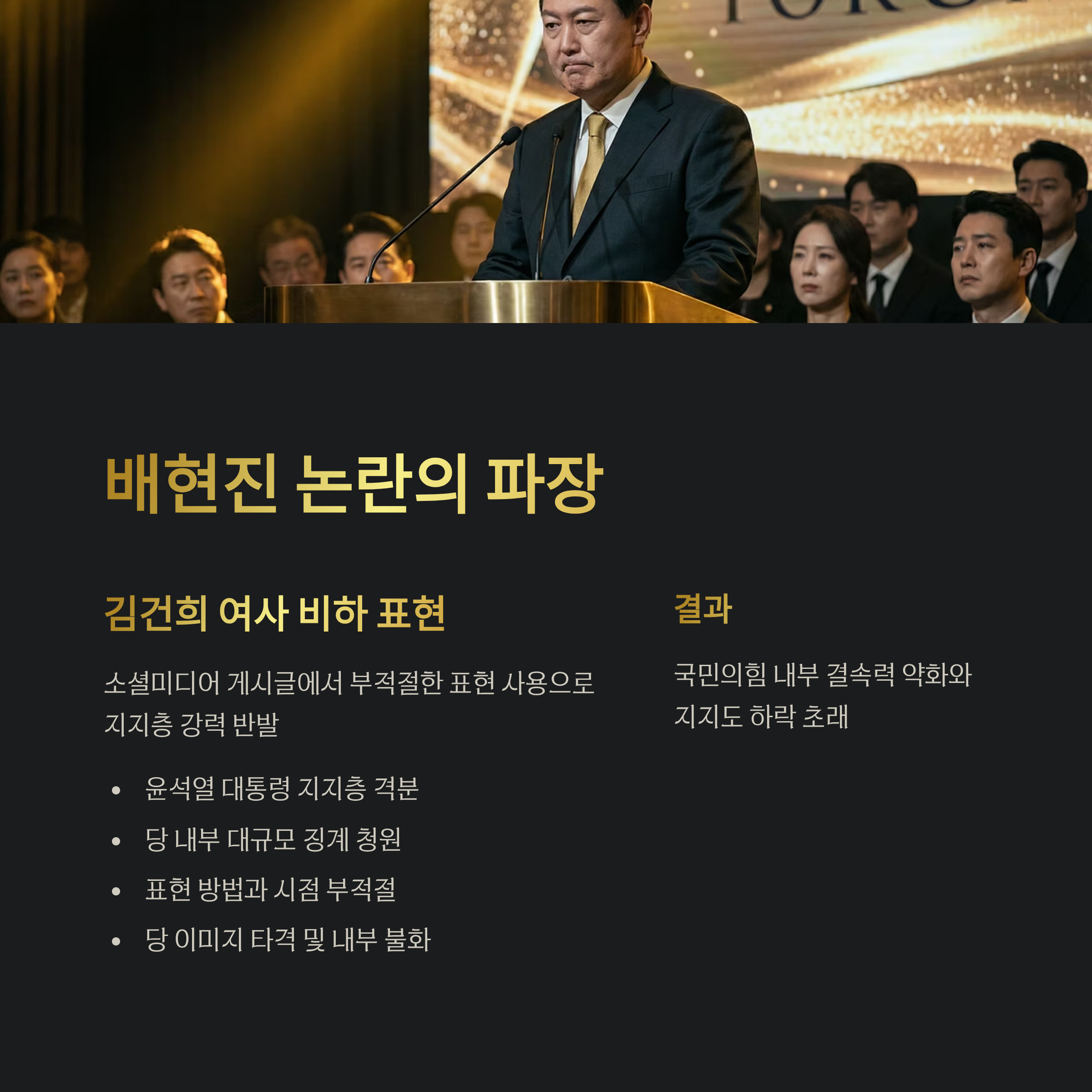| A. 배현진 의원의 김건희 여사 비하 발언은 국민의힘의 결속력을 약화시키고 내부 지지층에 불만을 유발하는 결과를 초래했습니다. 이어지는 반발로 당 이미지와 지지도가 저하된 상황입니다. |