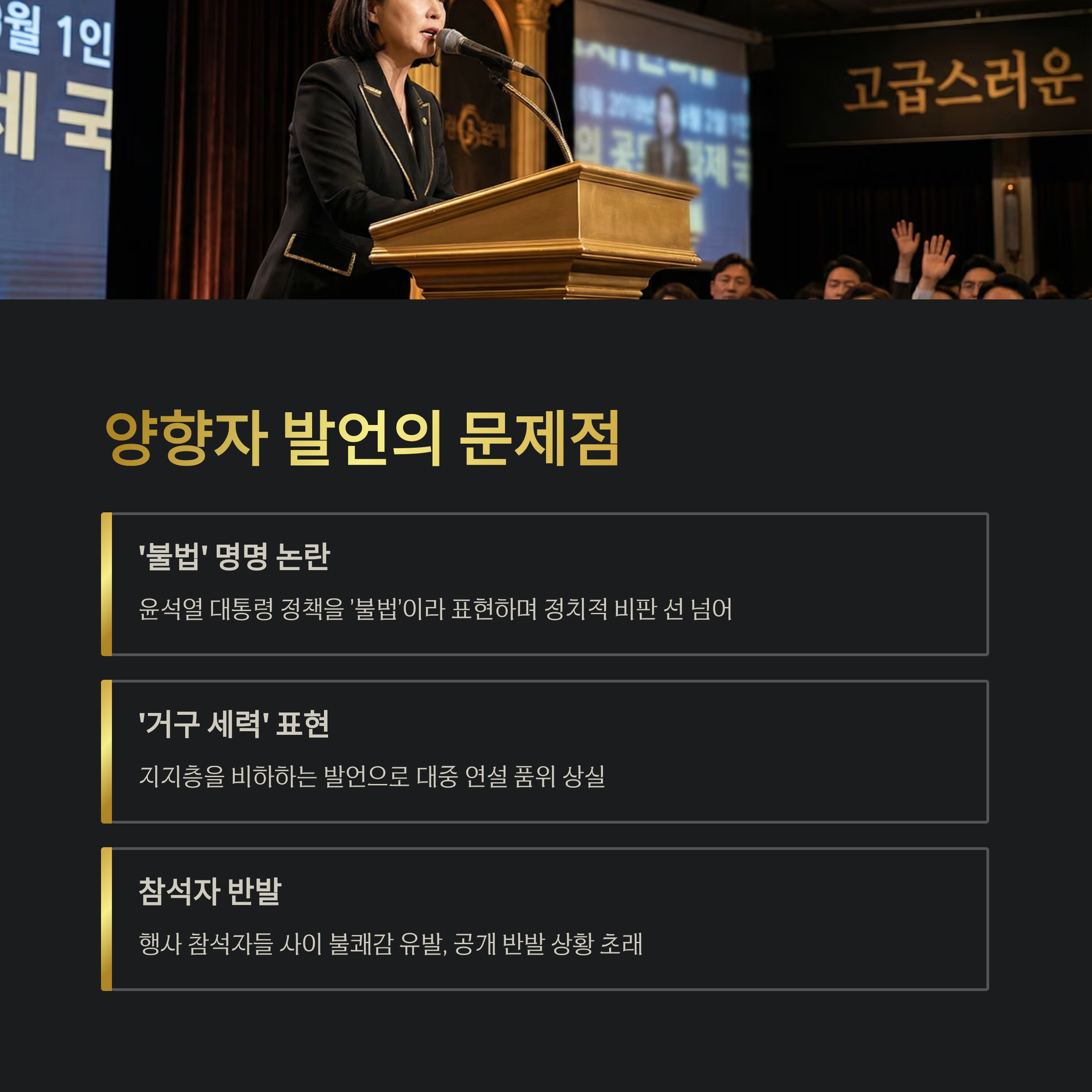양향자 의원이 윤석열 대통령의 정책을 '불법'이라 명명하며, 그의 지지층을 '거구 세력'으로 표현한 것은 논란의 불씨를 더욱 키웠습니다. 이는 단순히 윤석열 정권에 대한 정치적 비판이라는 선을 넘어서 여성 국회의원으로서 대중 연설 중 가장 기본적인 품위를 잃었다는 비판을 받습니다. 특히, 해당 발언은 행사 참석자들 사이에 불쾌감을 유발하며 일부 참석자들이 공개적으로 반발하는 상황까지 초래되었습니다. 결과적으로 양향자 의원의 발언은 그 자체로 국민의힘에 부담을 주는 정치적 자책골로 작용할 수 있습니다.