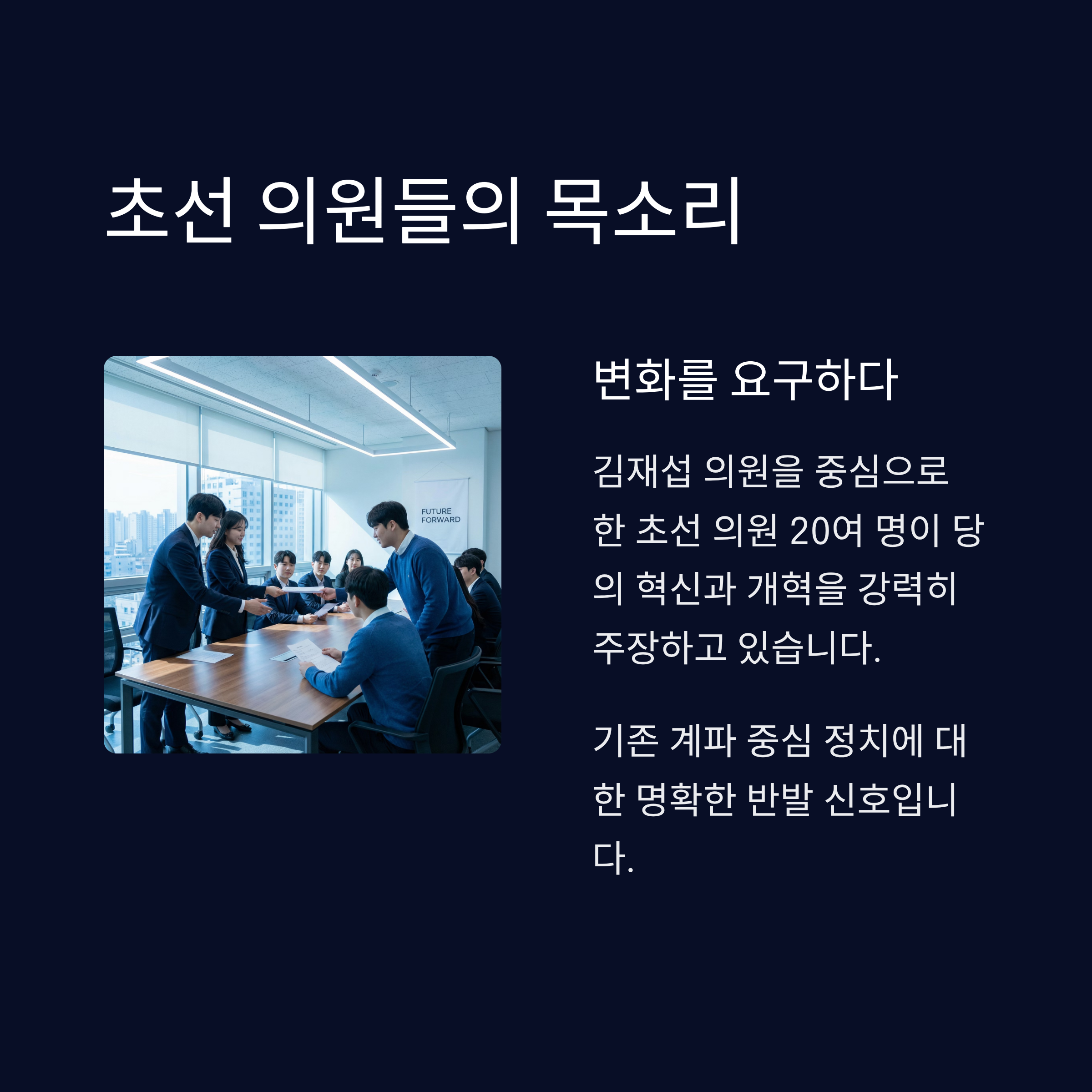 | A. 초선 의원들의 집단행동은 젊은 정치인들이 당 내부에서 변화와 혁신을 촉구하는 신호로 해석할 수 있습니다. 이는 기존 지도부와 계파 중심 정치에 대한 반발로도 볼 수 있습니다. |