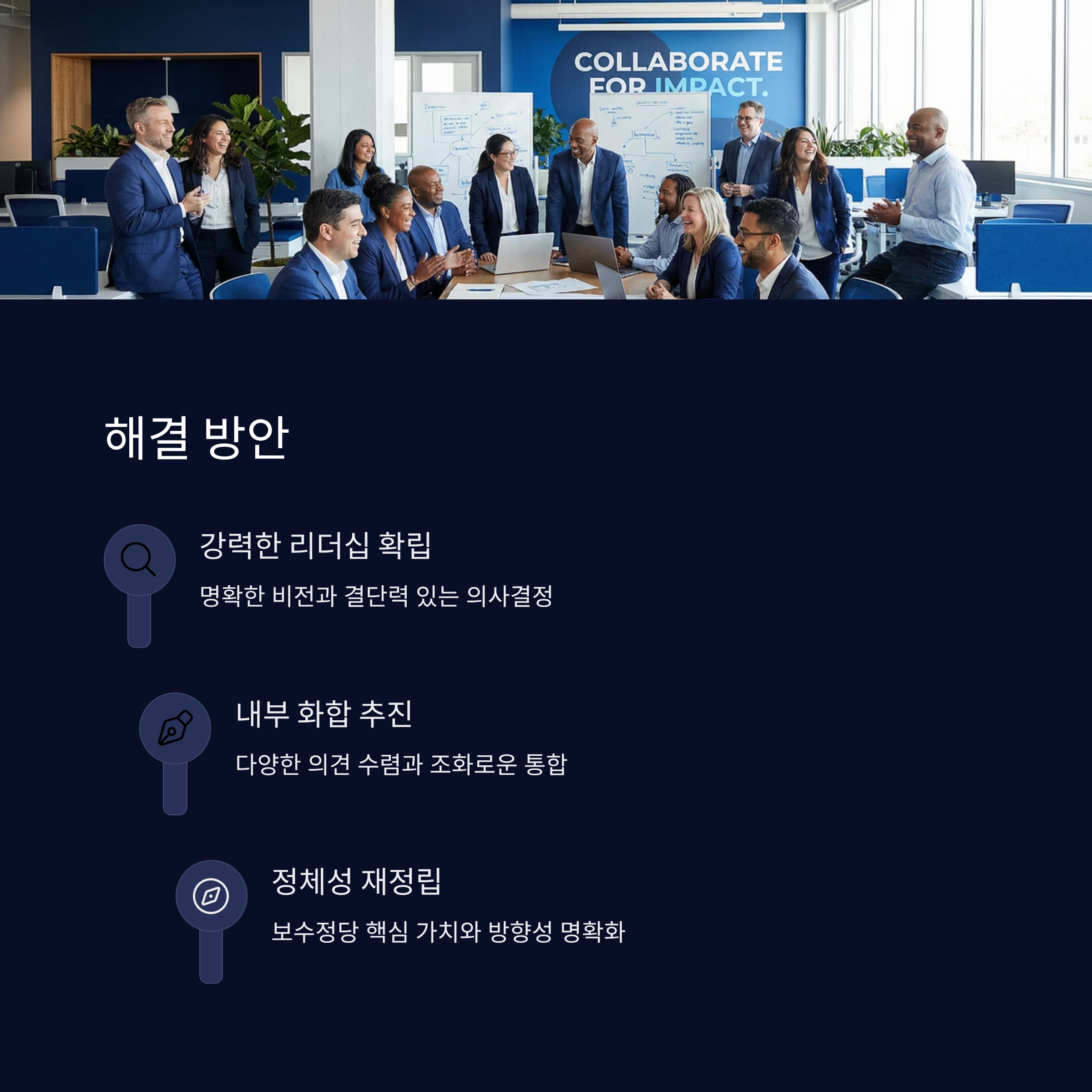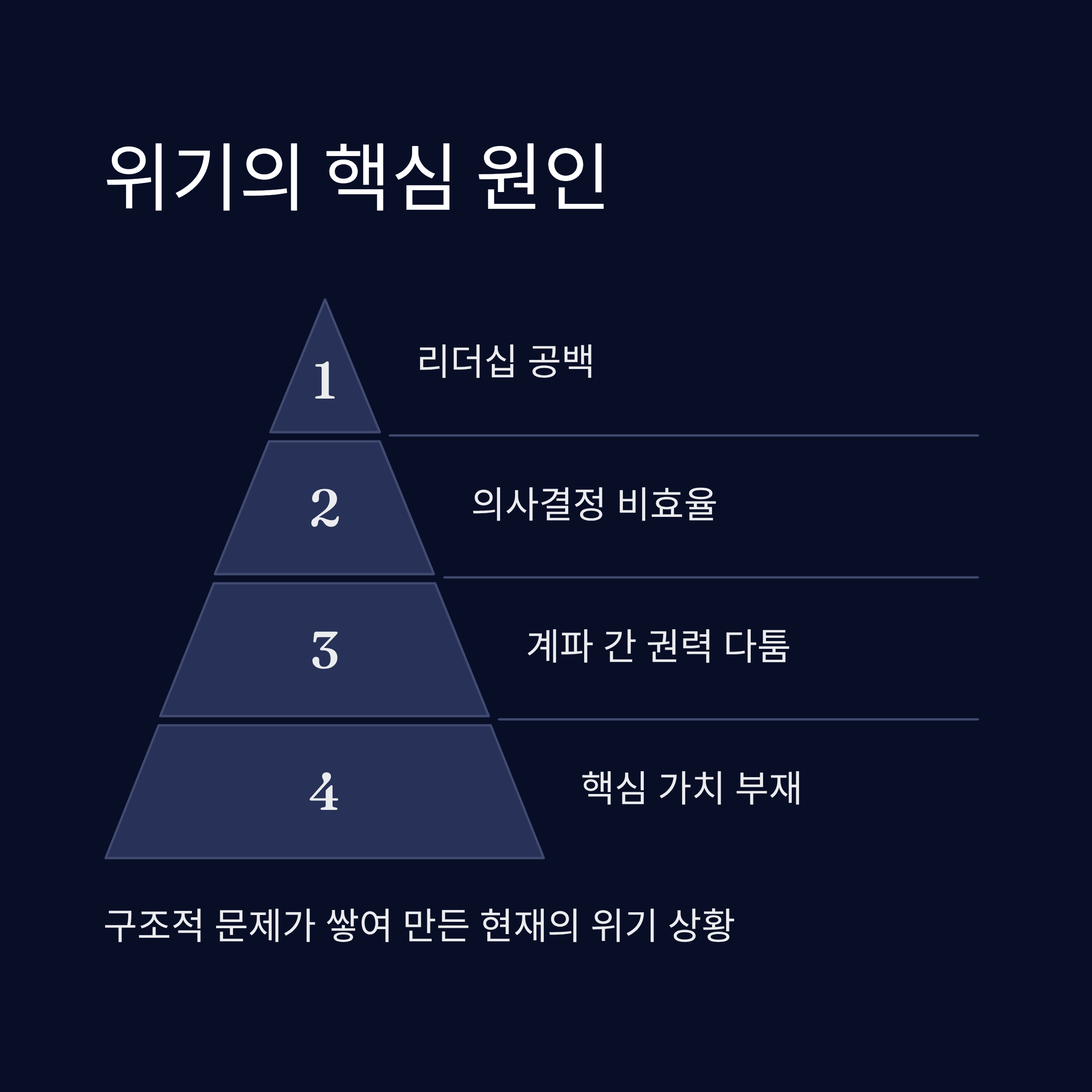 리더십은 단순히 이견을 조율하거나 의견을 분배하는 것으로 해결되지 않습니다. 갈등 조정 및 사과와 같은 민감한 사안에서는 보다 강력한 결단과 정체성 회복이 요구됩니다. 현재의 상황에서 명확한 비전 없이 중립적인 태도만을 유지한다면, 지도부에 대한 불신이 더 커질 위험이 있습니다.