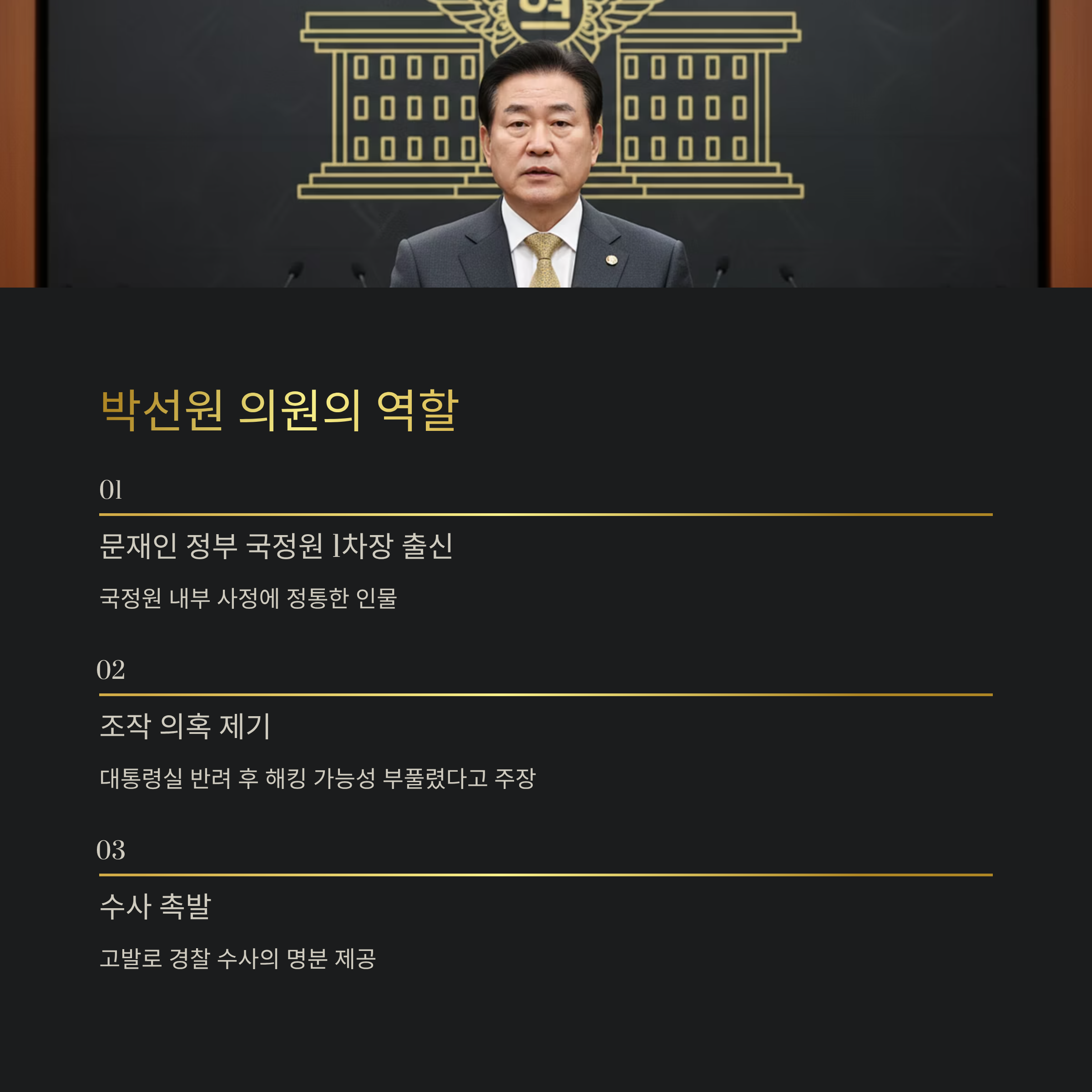 이번 수사를 촉발시킨 고발인은 더불어민주당 박선원 의원입니다. 그는 문재인 정부 시절 국정원 제1차장을 지내 국정원 내부 사정에 정통한 인물입니다. 박 의원은 "최초 보고서 초안에는 문제가 없었으나, 당시 윤석열 정부 대통령실의 반려 후 해킹 가능성을 부풀린 최종 보고서가 작성됐다"고 주장하며 ‘조작’ 의혹을 제기했습니다. 즉, 정당한 보고서 수정 및 보완 절차를 ‘외압에 의한 조작’으로 규정하며 수사의 명분을 제공한 것입니다.