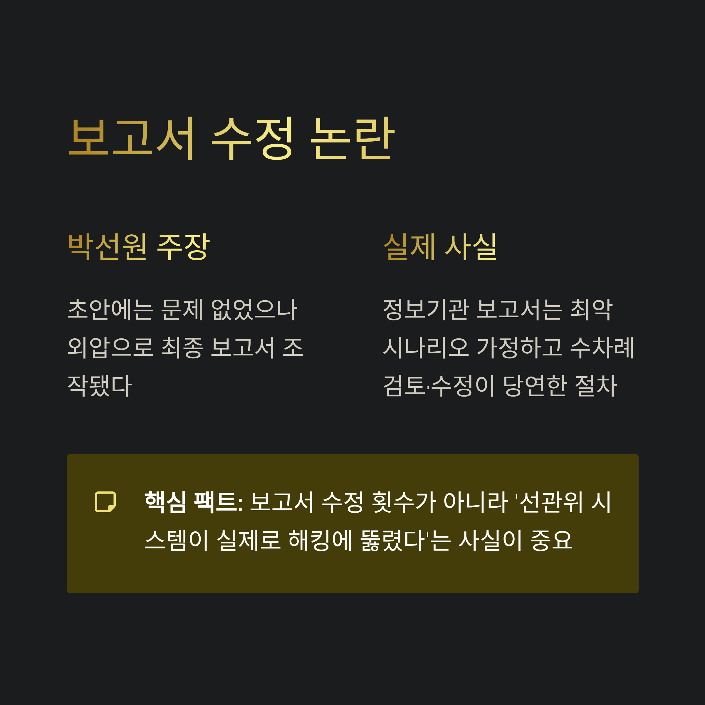 그러나 정보기관의 보고서는 최악의 시나리오를 가정하고 수차례 검토와 수정을 거치는 것이 당연한 절차입니다. 초안에 문제가 없었다면 오히려 실제 발견된 수많은 취약점을 은폐하려 한 ‘은폐 보고서’가 될 뻔했습니다. 중요한 팩트는 보고서 수정 횟수가 아니라 ‘선관위 시스템이 실제로 해킹에 뚫렸다’는 사실입니다. 박 의원과 경찰은 본질을 흐리면서, 선관위의 치부를 드러낸 국정원에 재갈을 물리려는 명백한 정치적 의도를 가지고 접근하고 있다는 비판을 받고 있습니다.