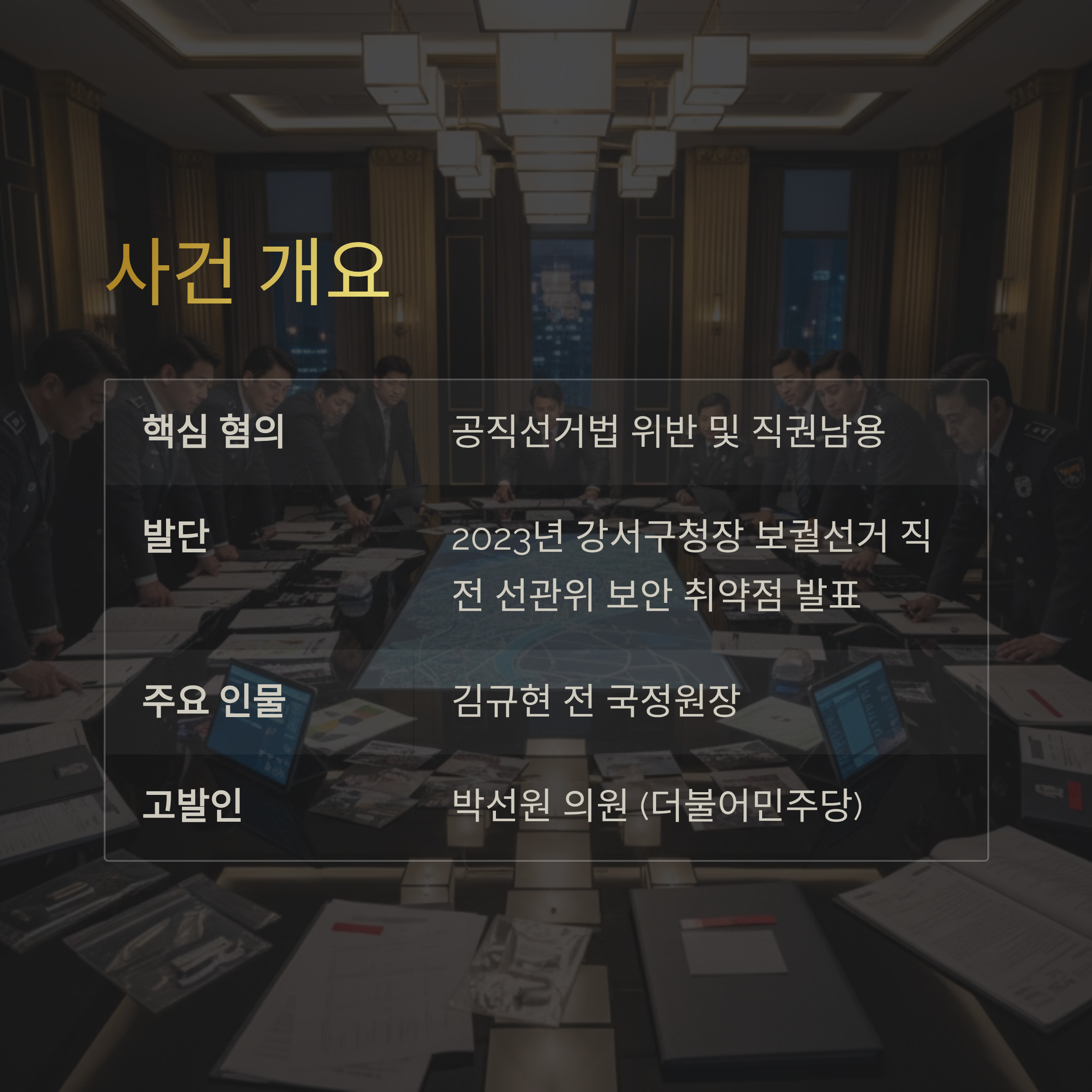 경찰이 적용한 핵심 혐의는 ‘선거 개입’입니다. 2023년 10월, 강서구청장 보궐선거를 하루 앞두고 국정원이 "선관위 시스템 해킹으로 유령 유권자 등록 및 개표 결과 조작이 가능하다"고 발표한 시점을 문제 삼고 있습니다. 당시 지도부였던 김규현 전 원장이 선거에 영향을 미칠 목적으로 발표 시점을 조율하고 내용을 왜곡했다는 것이 경찰의 시각입니다. 이를 근거로 김 전 원장을 출국금지 조치하고 강제수사에 착수하며, 헌정사상 정보기관의 수장이 안보 경고를 이유로 수사받는 초유의 사태가 벌어졌습니다.