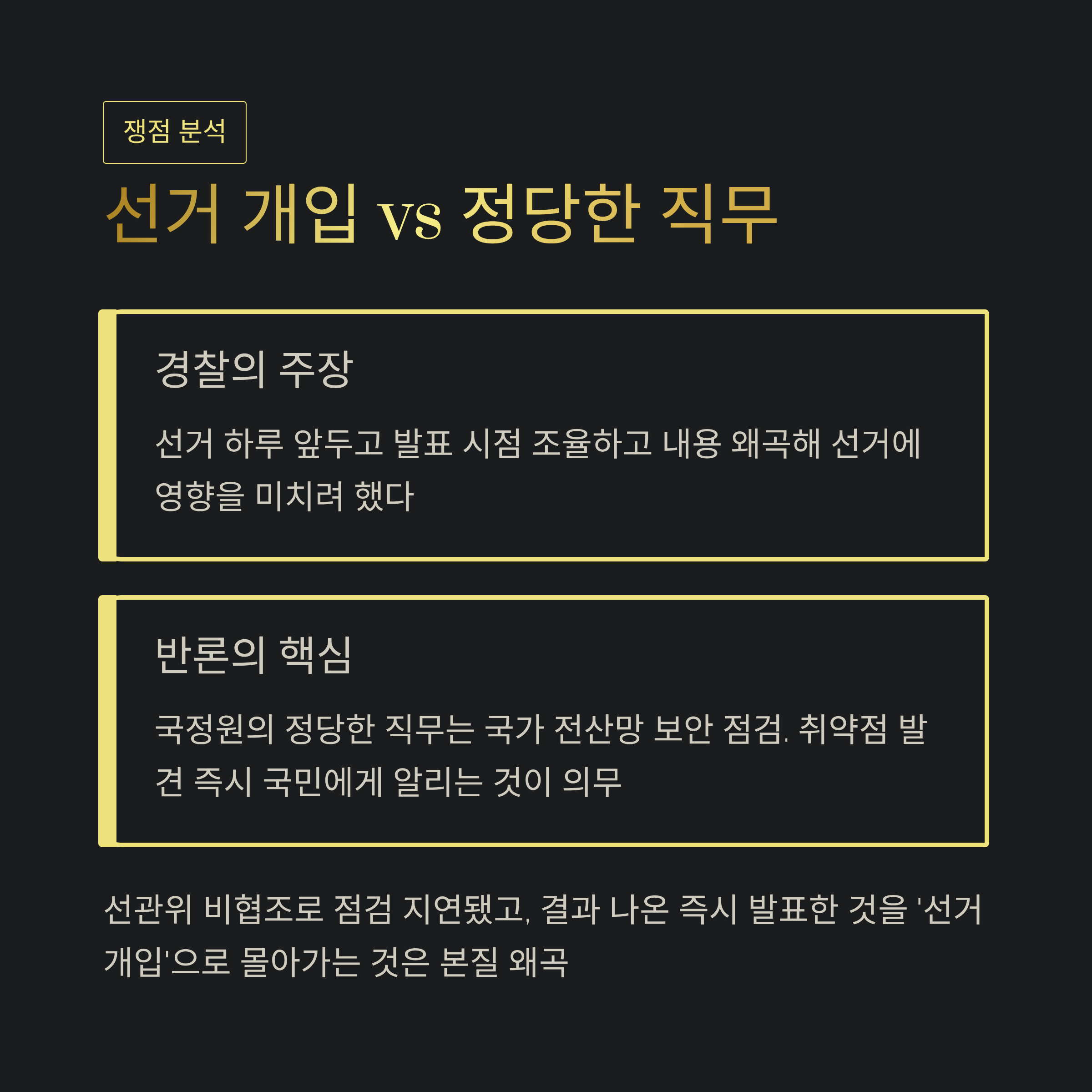 하지만 이는 국가 안보 기관의 정당한 직무 수행을 범죄로 호도하는 것이라는 반론이 지배적입니다. 국정원의 직무는 국가 전산망의 보안 취약점을 점검하고 위협을 예방하는 것입니다. 당시 선관위의 보안 시스템에 심각한 구멍이 있다는 사실을 확인하고도 이를 묵살했다면, 그것이야말로 명백한 직무유기입니다. 선관위 측의 비협조로 점검이 늦어졌고, 결과가 나온 즉시 국민의 알 권리를 위해 발표한 것을 두고 ‘선거 개입’의 잣대를 들이대는 것은 본질을 왜곡한 정치 공세에 불과합니다.
