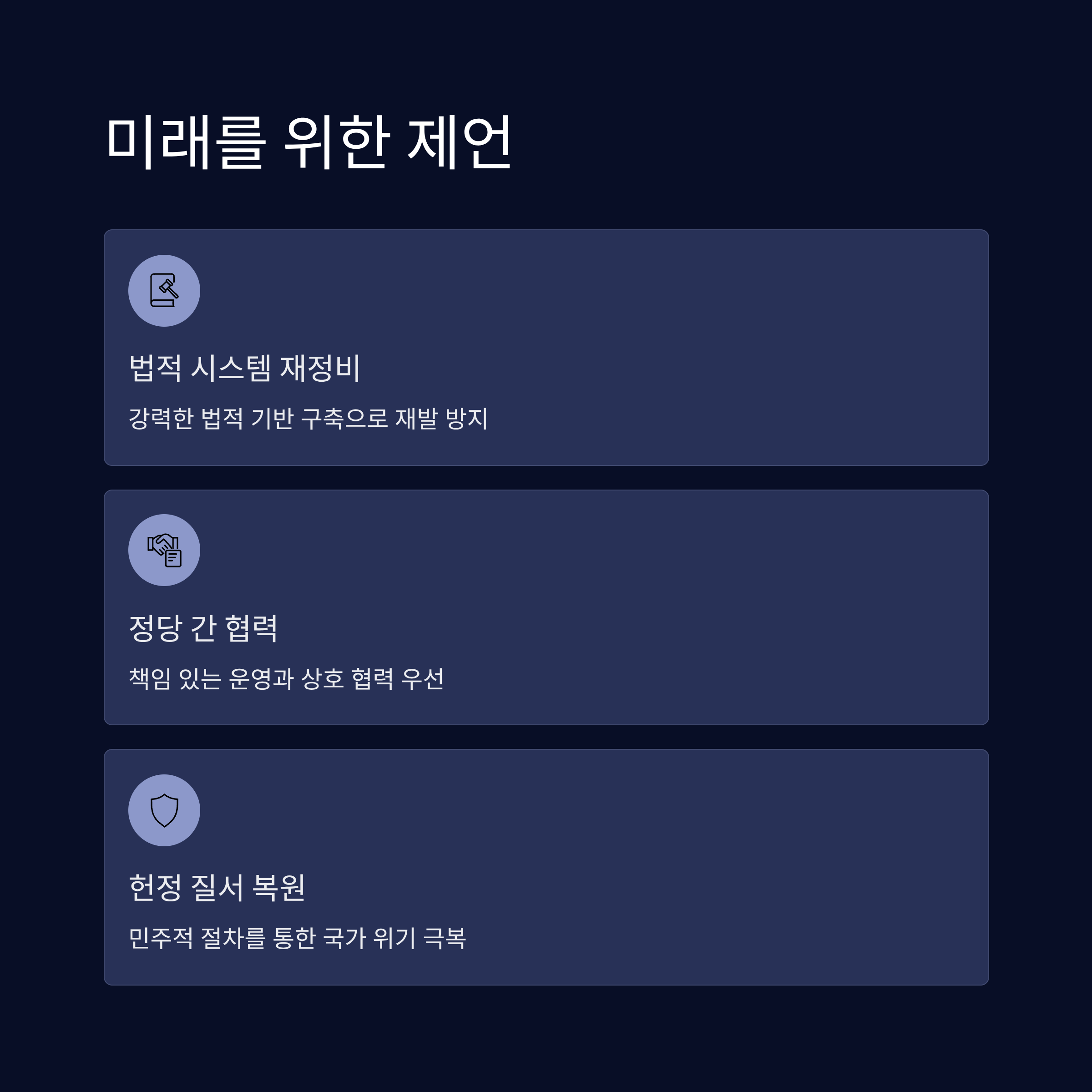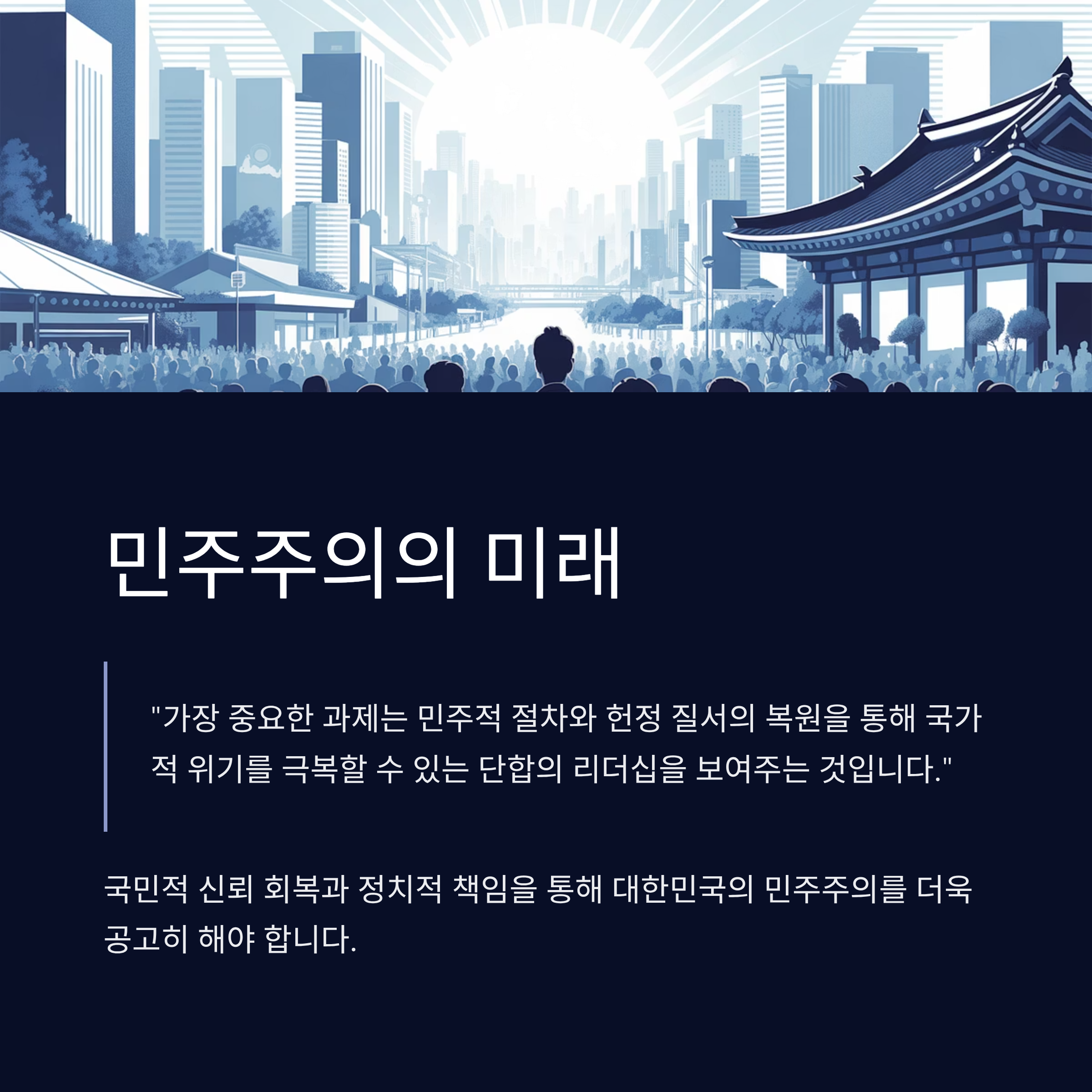 향후 대한민국은 보다 강력한 법적, 정치적 시스템의 재정비가 필요합니다. 국민적 신뢰를 얻기 위해 정치인들은 책임 있는 운영과 정당 간 협력을 우선시해야 합니다. 가장 중요한 과제는 민주적 절차와 헌정 질서의 복원을 통해 국가적 위기를 극복할 수 있는 단합의 리더십을 보여주는 것입니다.