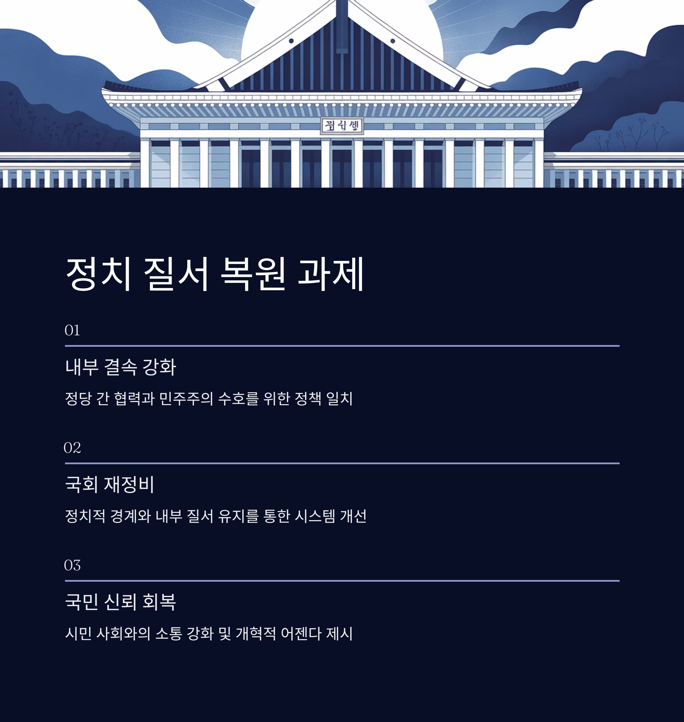 5. 정당 내부 결속을 강화하며, 미래의 정치 질서를 안정적으로 구축하는 것이 주요 과제로 부각됩니다.