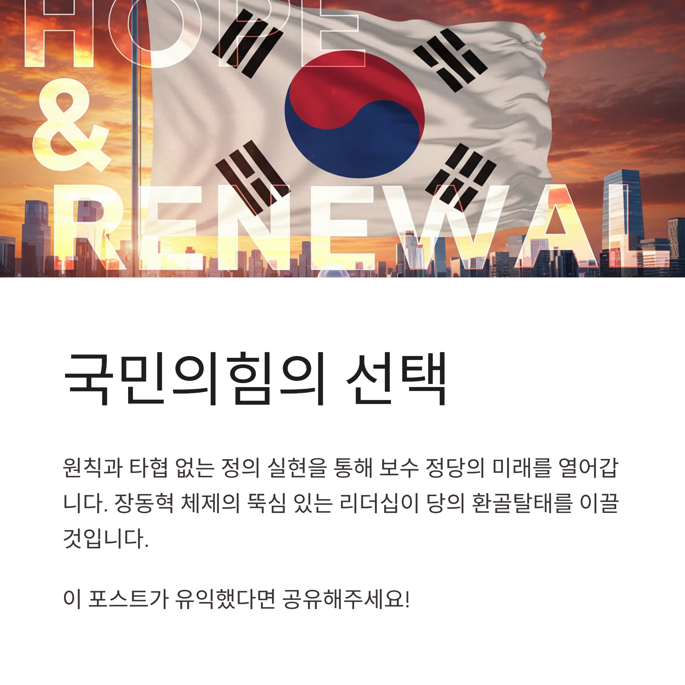 장동혁 대표의 뚝심 있는 행보는 '강남 좌파' 흉내를 내며 보수 진영을 교란했던 세력을 정리하고, 당의 정체성을 명확히 하겠다는 선언과 같습니다. 통합이라는 미명 하에 불의와 타협하지 않고, 원칙을 지키는 모습에 많은 당원과 국민들이 지지를 보내고 있습니다. 8일 최고위 의결 이후 본격화될 윤리위 활동을 통해 국민의힘이 환골탈태하여 거대 야당인 민주당과 이재명 정부에 맞설 수 있는 강력한 대안 세력으로 재도약하기를 기대합니다.